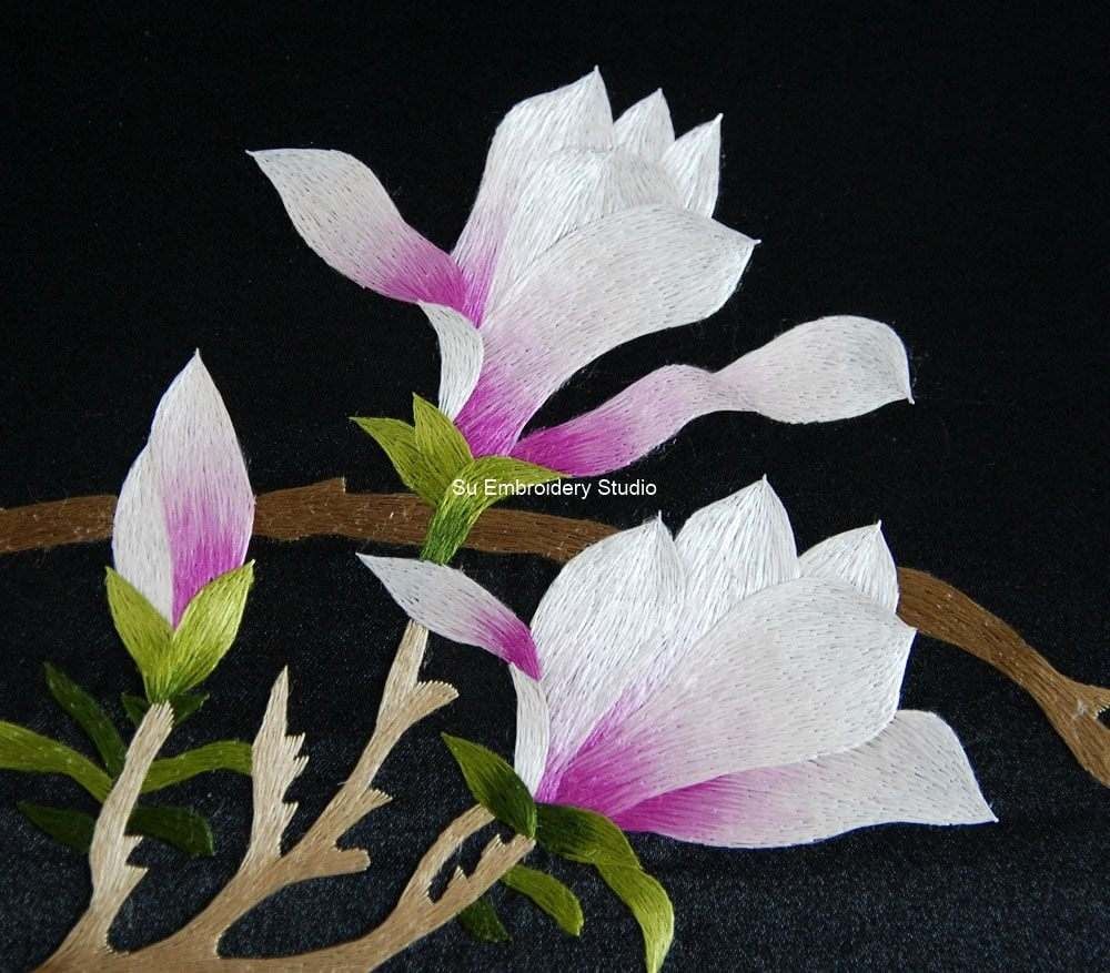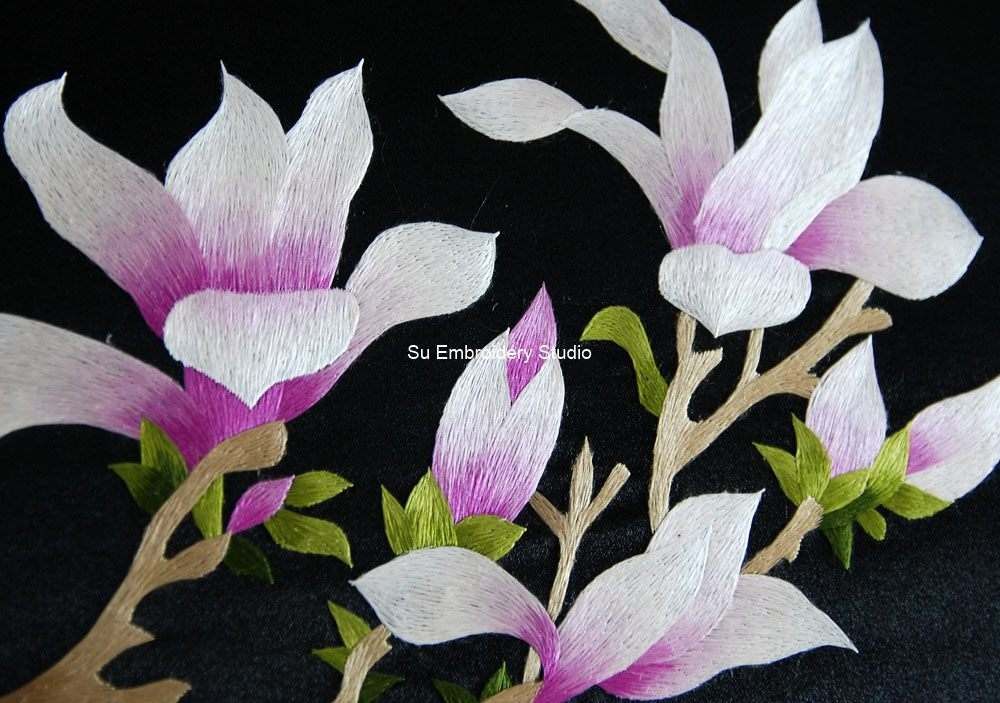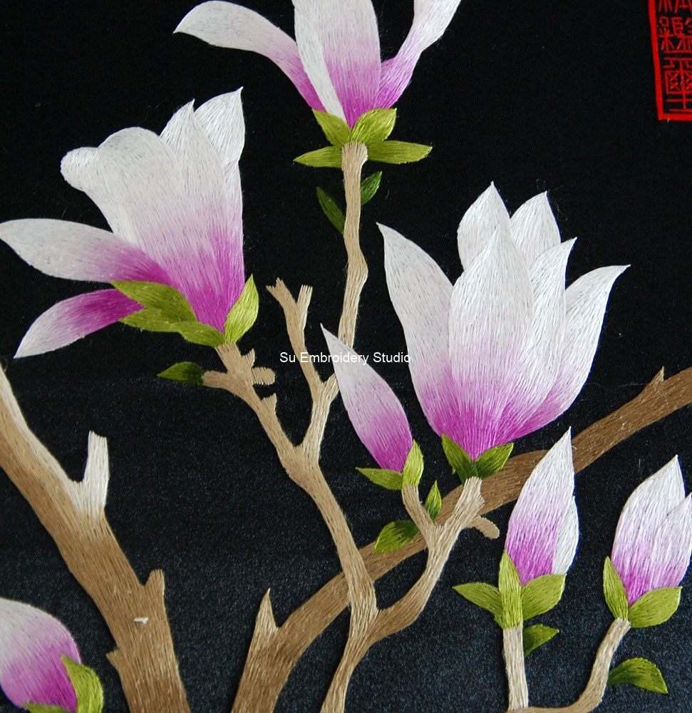 The use of contrasting colors against the black backdrop creates a visually striking effect, allowing the vibrant hues of the magnolia blossoms to pop and command attention. The lifelike representation achieved through precise stitching demonstrates the skill and artistry involved in traditional Chinese silk embroidery.