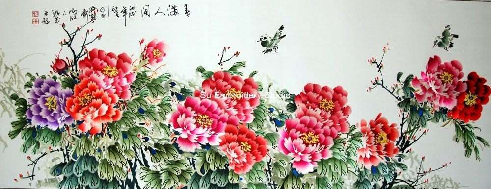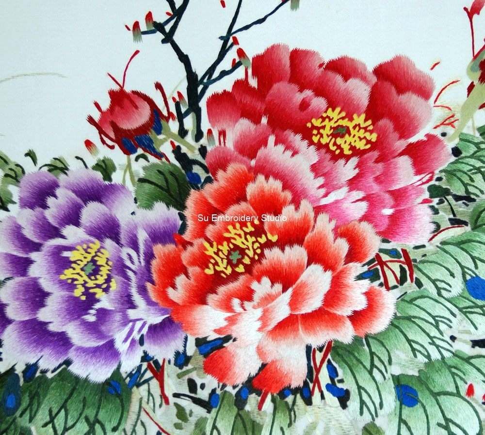 This Chinese silk embroidery is a stunning piece of art featuring a vibrant and detailed depiction of blooming peony flowerss, with small birds flying around them. The silk embroidery showcases intricate details and fine stitching, capturing the elegance and grace of the peonies. The peonies are predominantly in shades of red and pink, with one purple flower, and are intricately detailed, showcasing various layers of petals and stamens visible at the center. Green leaves and stems with intricate detailing surround the flowers, providing a lush backdrop. Small birds are embroidered around the flowers; they appear to be in flight and are depicted in black and white tones. There is Chinese text at the top left corner of the embroidery, written in black ink, contributing to the artwork’s authenticity. They mean 'Spring in everywhere'. The background of the Chinese embroidery is light-colored silk that accentuates the vibrant colors of the vibrant flowers.