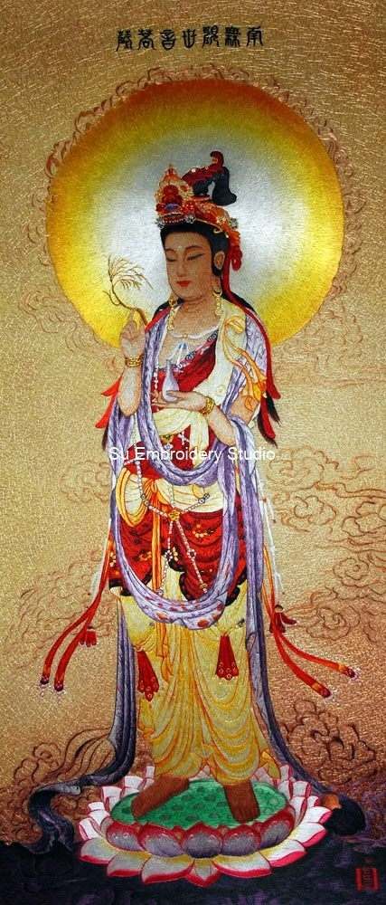 This Chinese silk embroidery portrays Candraprabha Bodhisattva, a revered figure associated with compassion in East Asian Buddhism. The central focus of the silk embroidery artwork is Candraprabha Bodhisattva, who stands gracefully on a lotus flower base, symbolizing purity and enlightenment.
