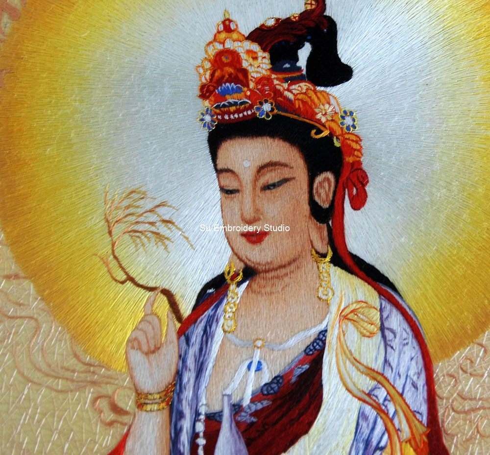 While ethical considerations prevent the description of facial features, the overall craftsmanship and attention to detail are evident throughout the artwork. This Chinese hand embroidery is a testament to the artistic skill and cultural reverence encapsulated in depictions of Candraprabha Bodhisattva.