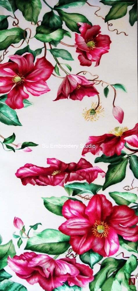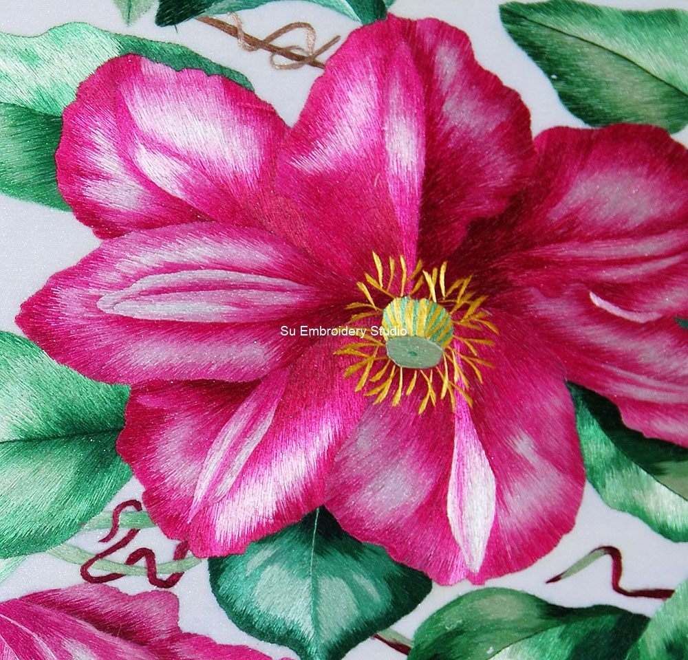 This Chinese silk embroidery depicts clematis flowers in vibrant shades of pink and red, with detailed petals and prominent yellow stamens. The green leaves and stems are intricately hand embroidered, showcasing the delicate and detailed nature of hand embroidery. The image showcases a collection of flowers in full bloom, characterized by their vibrant pink and red hues. Each petal is intricately hand embroidered, displaying a gradient of color from deep red to light pink. Yellow stamens at the center of each flower add a contrasting color element that enhances the visual appeal. Green leaves with detailed veining surround the flowers, adding depth and realism to the depiction. The background is white or very light-colored, ensuring that the colorful embroidery stands out prominently.