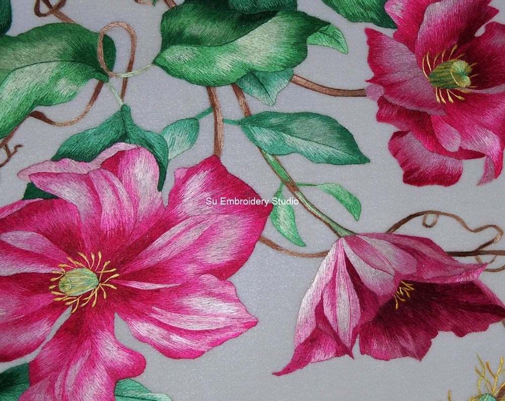 Set against a white or very light-colored background, the vibrant colors of the clematis flowers take center stage, ensuring that the intricate embroidery stands out prominently. This Chinese sembroidered silk is not only a testament to the rich tradition of silk craftsmanship but also a timeless expression of the beauty found in nature.
