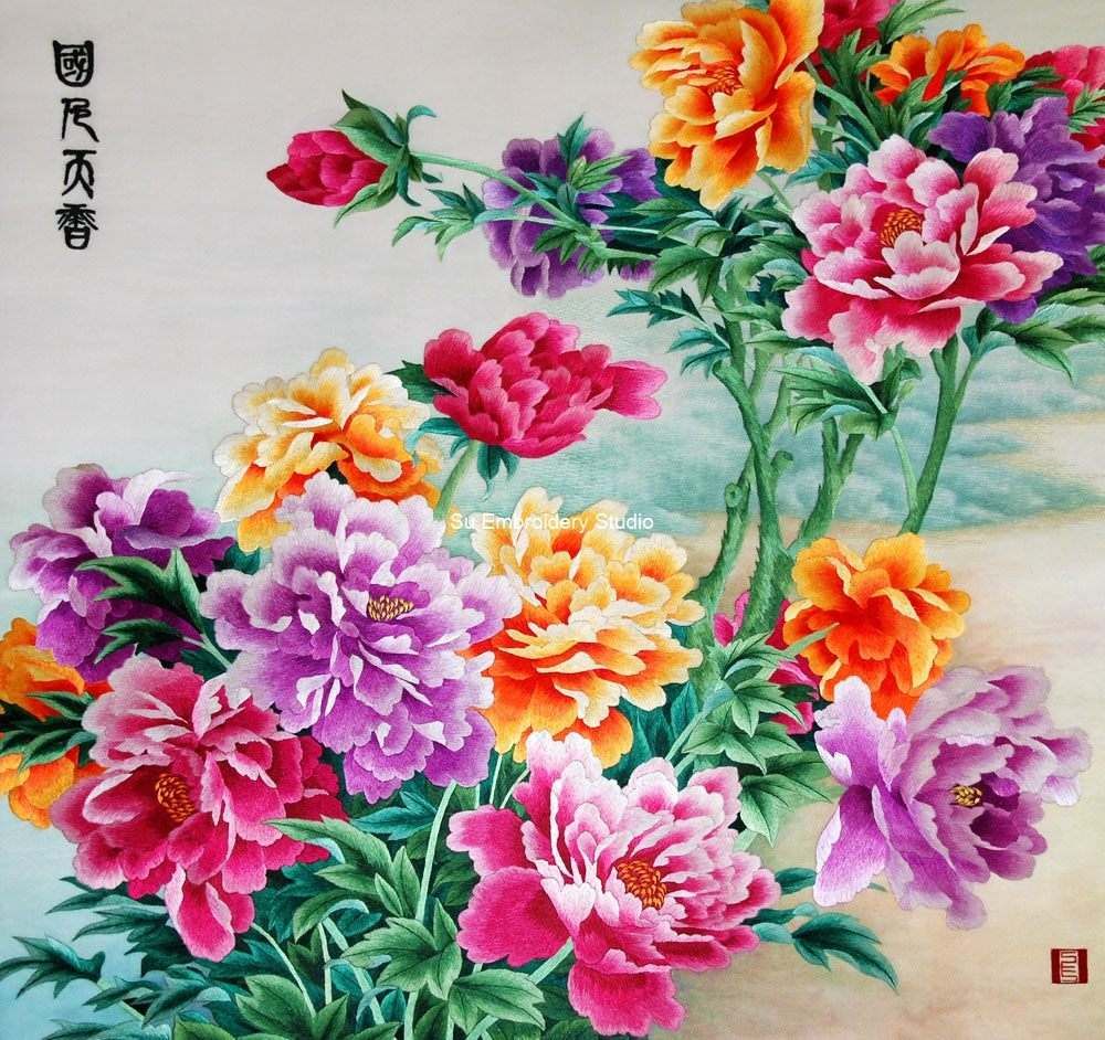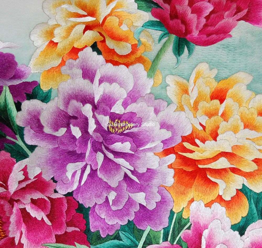 This Chinese silk embroidery features a vibrant and colorful arrangement of peonies. The embroidery painting is detailed and lifelike, with intricate threads arranged to create realistic representations of the blossoms. The flowers are rendered in shades of pink, purple, orange, and yellow, each petal painted with gradients to depict light and shadow. Green leaves and stems provide a contrasting backdrop to the bright flowers, adding depth to the composition. The background is subtle yet textured, allowing the flowers to be the focal point while still providing context for their environment. The embroidered silk painting is a beautiful example of the intricate artistry and lifelike texture of silk thread painting. It is perfect for those who appreciate traditional art and the beauty of nature.
