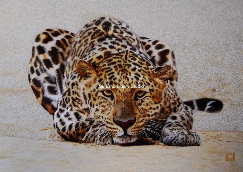 The leopard, portrayed in a low crouch, is brought to life through the intricate silk embroidery that captures the nuanced texture of its fur. Various shades of brown, intricately interspersed with black spots and rosettes, contribute to the lifelike quality of the piece. The intensity in the leopard's eyes, meticulously hand embroidered with silk threads, adds a compelling dimension to the embroidery artwork.