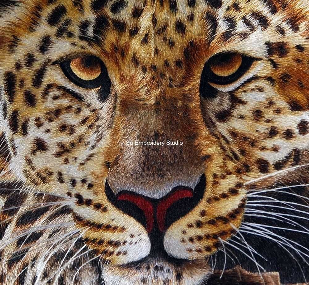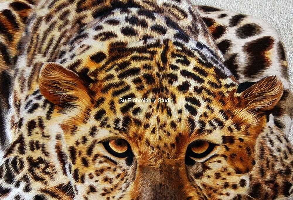 The embroidered background, transitioning from light to dark tones with a subtle gradient effect, serves as a skillful backdrop that enhances the presence of the leopard. This attention to detail not only underscores the craftsmanship of the silk embroidery but also places the viewer in the immediate presence of this majestic big cat.
