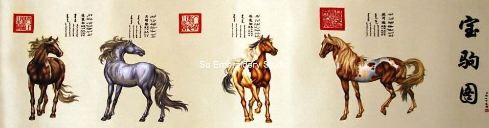 The silk embroidery features four majestic horses, each strikingly portrayed in various poses and colors. The horses showcase a harmonious blend of brown, grey, golden, and spotted white-brown hues, capturing the dynamic and spirited nature of these revered animals. The careful attention to detail in the depiction of the horses' forms and movements reflects the artist's commitment to realism and artistic finesse.