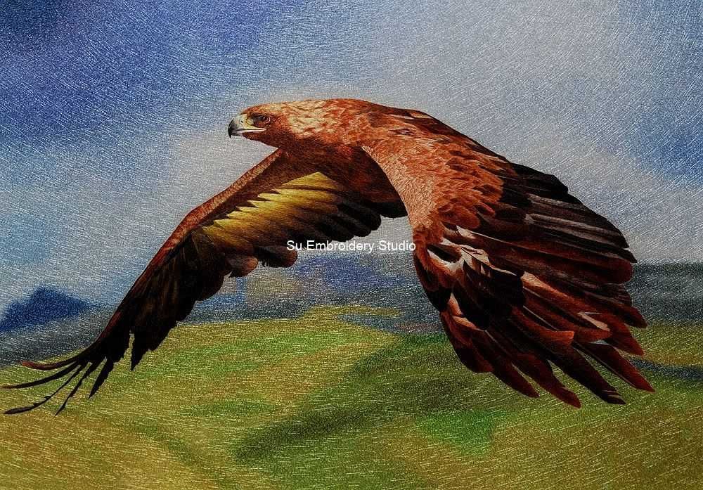 This Masterpiece Chinese silk embroidery painting depicts a golden eagle in flight over a landscape. The main subject, the eagle, is skillfully hand embroidered with brown, white, and yellow silk threads to depict the intricate details of its feathers. The eagle is captured mid-flight with its wings spread wide, showcasing the detailed hand embroidery work on each feather. The fully hand embroidered background features a serene landscape with green fields and distant mountains under a blue sky, created with various shades of green, blue, and white silk threads. The texture of the embroidered background adds depth and richness to the colors and makes the embroidered eagle stand out.