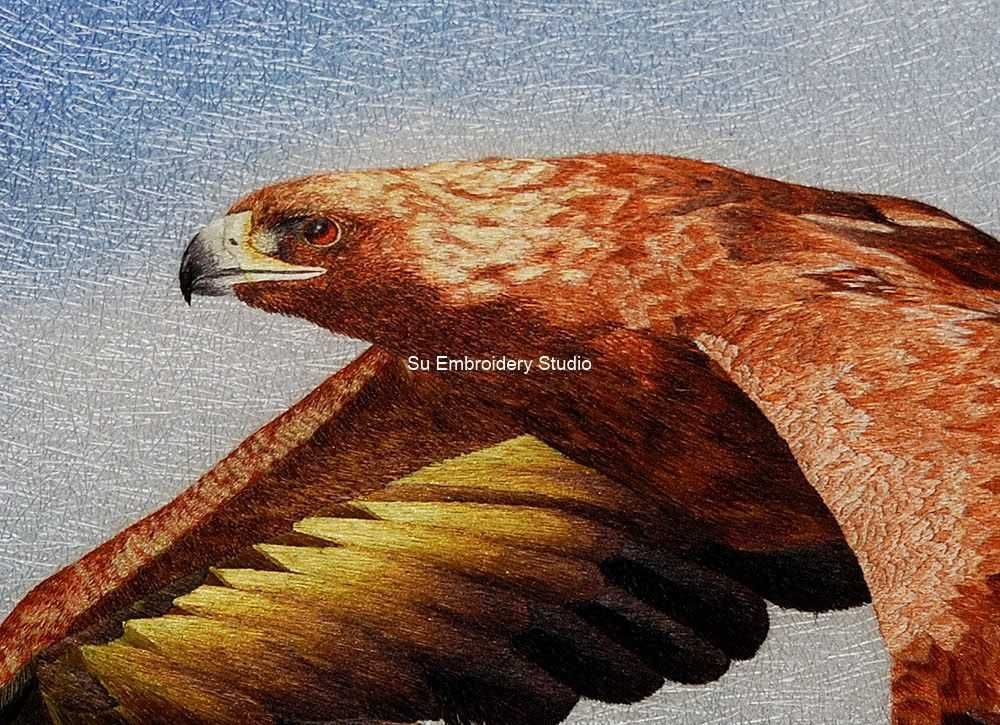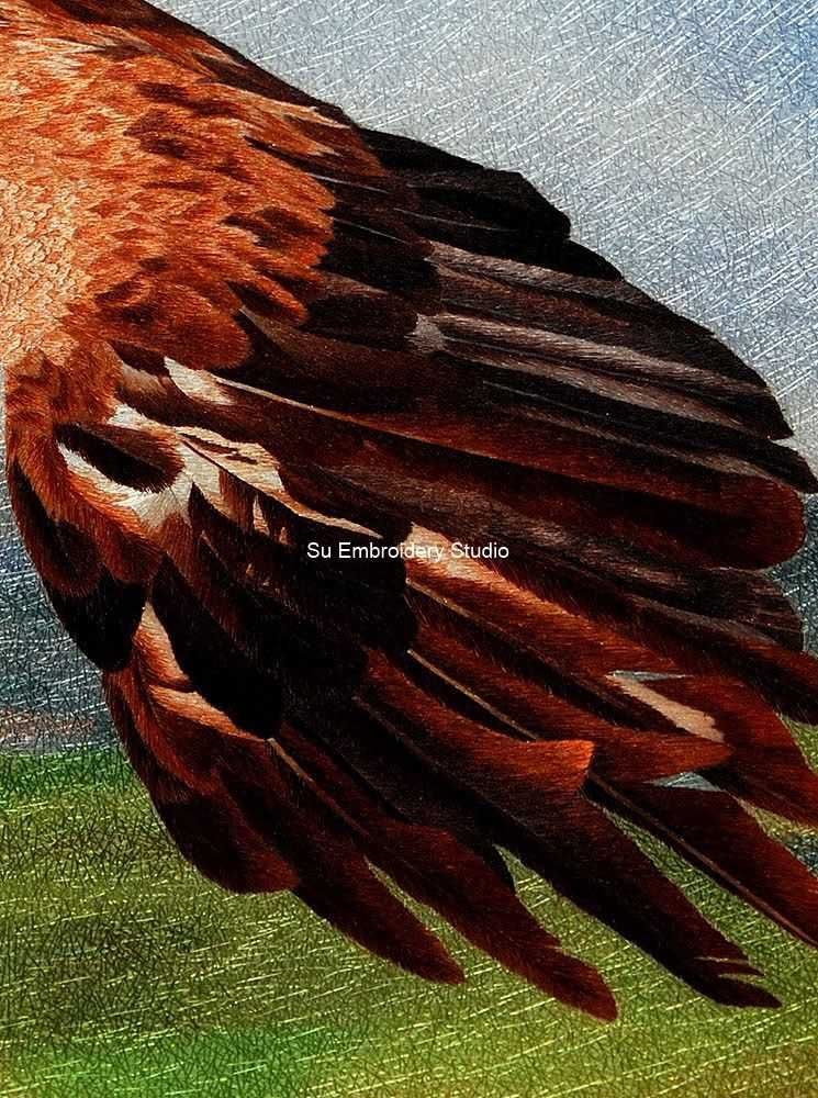 A deliberate contrast is achieved between the detailed foreground, where the eagle commands attention, and the softer, less detailed background landscape. This play of focus creates a visual narrative that not only captures the majestic beauty of the eagle but also emphasizes its significance against the backdrop of nature. This Chinese embroiderymasterpiece is a testament to the artistry and skill of the embroidery artist from Su Embroidery Studio, preserving the spirit of the eagle's flight with every meticulously crafted stitch.
