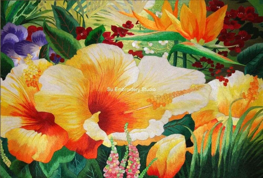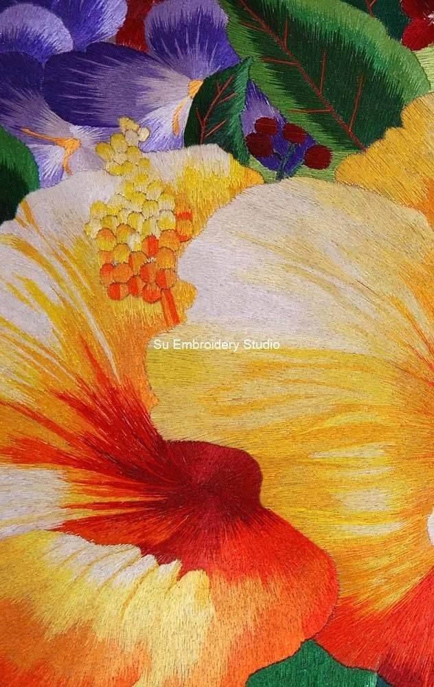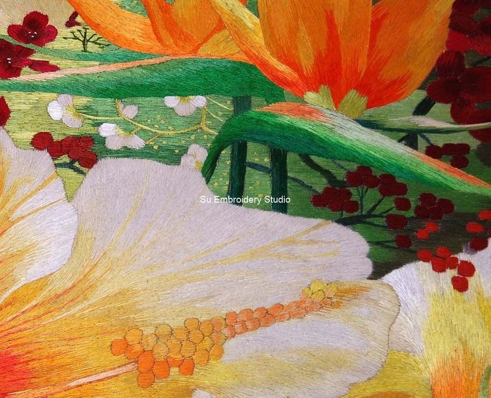 This Chinese silk embroidery is a vibrant and colorful display of various tropical flowers including hawaiin flowers and bird of paradise. The embroidery artwork is teeming with life, featuring prominent, large blossoms of hawaiin flowers with their delicate petals in shades of yellow and orange silk threads, accentuated by a rich red center. Nestled among the hibiscus are radiant bird of paradise flowers, their orange and yellow petals unfolding gracefully. Clusters of red berries and purple pansies add depth and contrast to the composition. The meticulous detailing in the embroidery painting highlights the intricate veining on the leaves and petals, lending an air of realism to the piece. This embroidered silk art could be a focal point in any room or gallery, drawing viewers into its lush, botanical world. It is a fully hand embroidered painting, including its background.