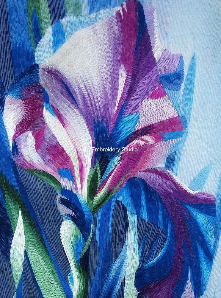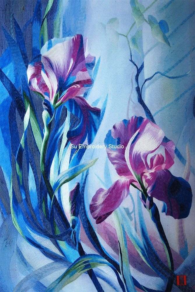 This silk embroidery painting features exquisite irises in full bloom. The silk embroidery artwork captures the delicate and intricate nature of the flowers, with their petals exhibiting shades of purple, pink, and white. The irises are surrounded by slender green leaves and stems, set against a mesmerizing backdrop of swirling blues that evoke a sense of movement and fluidity.
