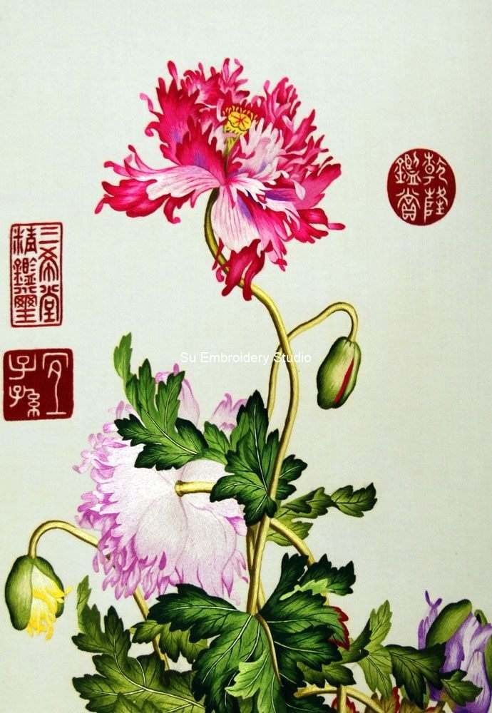 This Chinese silk embroidery is reproduced from Lang Shining's painting. Lang Shining was an Italian painter who lived in China the Qing Dynast. He applied the skills in Western oil paintings to paint Chinese style paintings. It features a vibrant and detailed depiction of oriental poppy flowers. The silk embroidery artwork showcases intricate stitching techniques, rendering the flowers and leaves with lifelike precision. The blossoms are in various stages of bloom, displaying a mix of pink and white petals that are richly textured and delicately shaded to capture their natural elegance. Green stems and leaves provide a contrasting backdrop, enhancing the visual appeal.