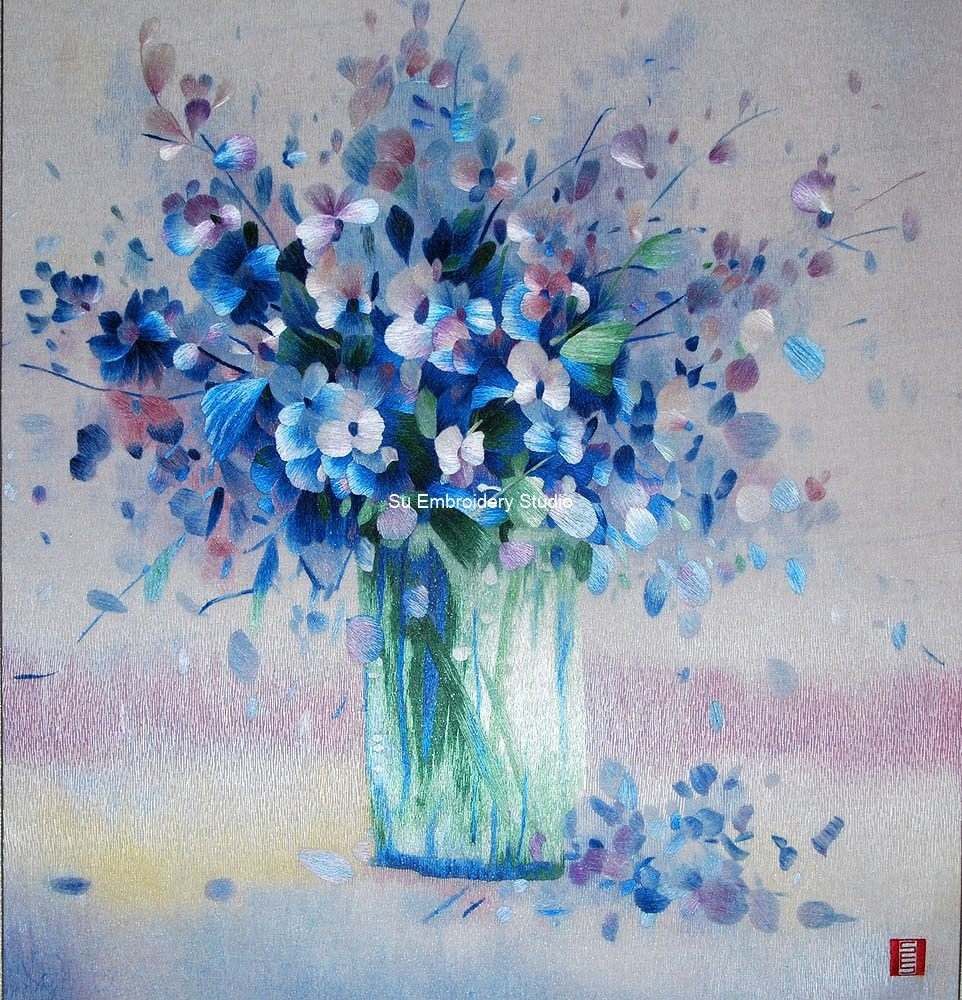 This silk embroidered painting showcases a vibrant bouquet of flowers in a harmonious blend of various shades of blue and white, accented by lush green leaves. The intricate hand embroidery work captures the delicate details of each petal and leaf with precision, employing various shades to depict the interplay of light and shadow, resulting in a lifelike and three-dimensional appearance.