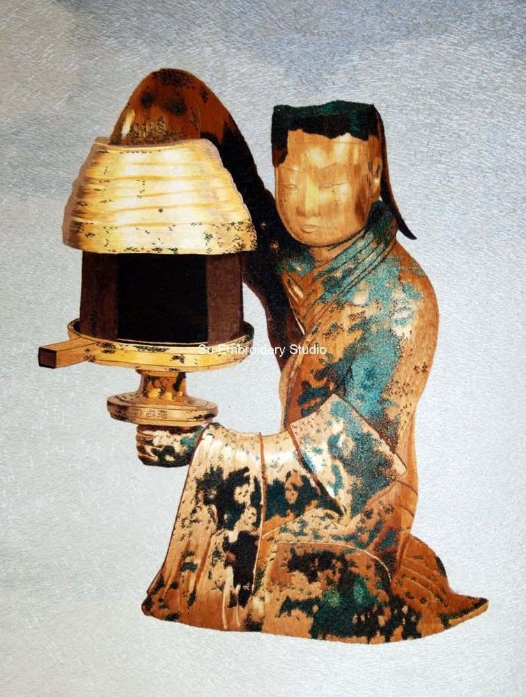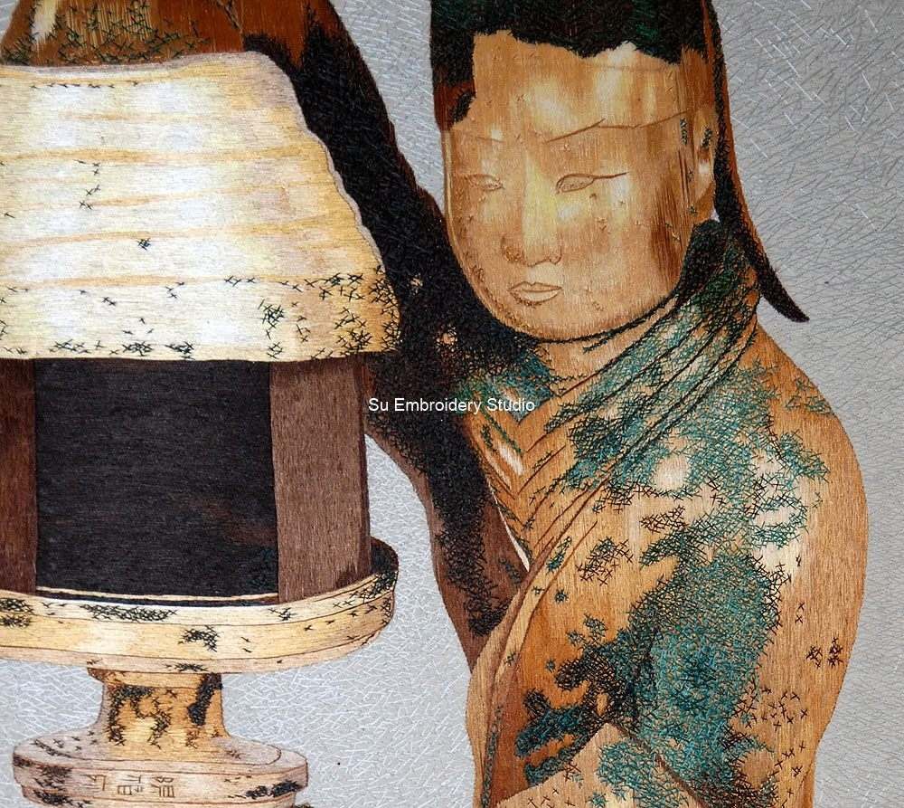 The silk embroidery faithfully replicates the intricate details of the Han artifact, showcasing a kneeling maid holding a lamp in a full-bodied gilt setting. The maid's elegant expression and the meticulous reproduction of the lamp's design reflect the artistry of the original piece. The hand embroidery captures the extraordinary integration of practicality and decorativeness seen in the Changxin palace lamp, where the maid's hollow sleeve allows smoke from the lit-up candle to rise and be collected in her body, cleverly designed to avoid air pollution.