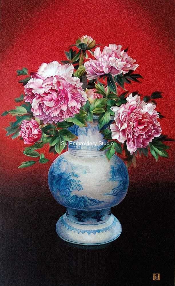 This Masterpiece Chinese silk embroidery painting depicts vibrant pink peonies in a blue and white porcelain vase against a rich red background. Both the flowers and the background are densely hand embroidered with fine silk threads. The main focus is on the large, lush peonies with intricately embroidered details, showcasing various shades of pink and white petals, surrounded by green leaves. The flowers are placed in an ornate blue and white porcelain vase featuring an intricate picture of Chinese landscape painting. The stitches in the vase are so short that the whole hand embroidery work looks as smooth as the real porcelain. A rich, textured red background surrounds the flowers and vase, providing a stark contrast that makes the central peonies and vase pop. This silk embroidery artwork would make a great addition to any art collection and would be a perfect gift for embroidery enthusiasts and flower lovers alike.