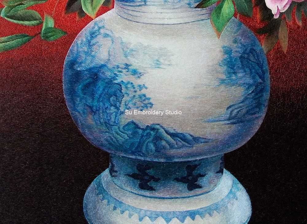 Nestled in the heart of this embroidered art is an ornate blue and white porcelain vase, itself a work of art adorned with intricate designs, including delicate Chinese landscape. Poised on an equally detailed pedestal, the vase exudes sophistication and craftsmanship.