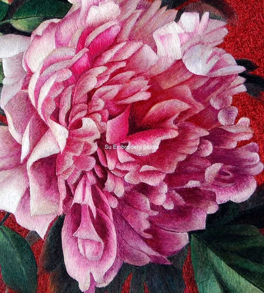 The opulent backdrop, rendered in a textured red hue, serves as a dramatic contrast, allowing the central image to radiate with vivid intensity. Every stitch captures the essence of the peonies' beauty, making this Chiense embroidery artwork a true testament to the skill and artistry of the embroidery artist from Su Embroidery Studio.