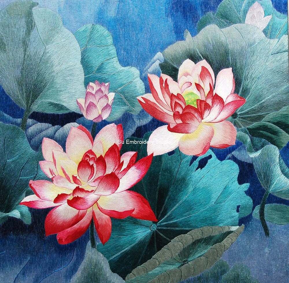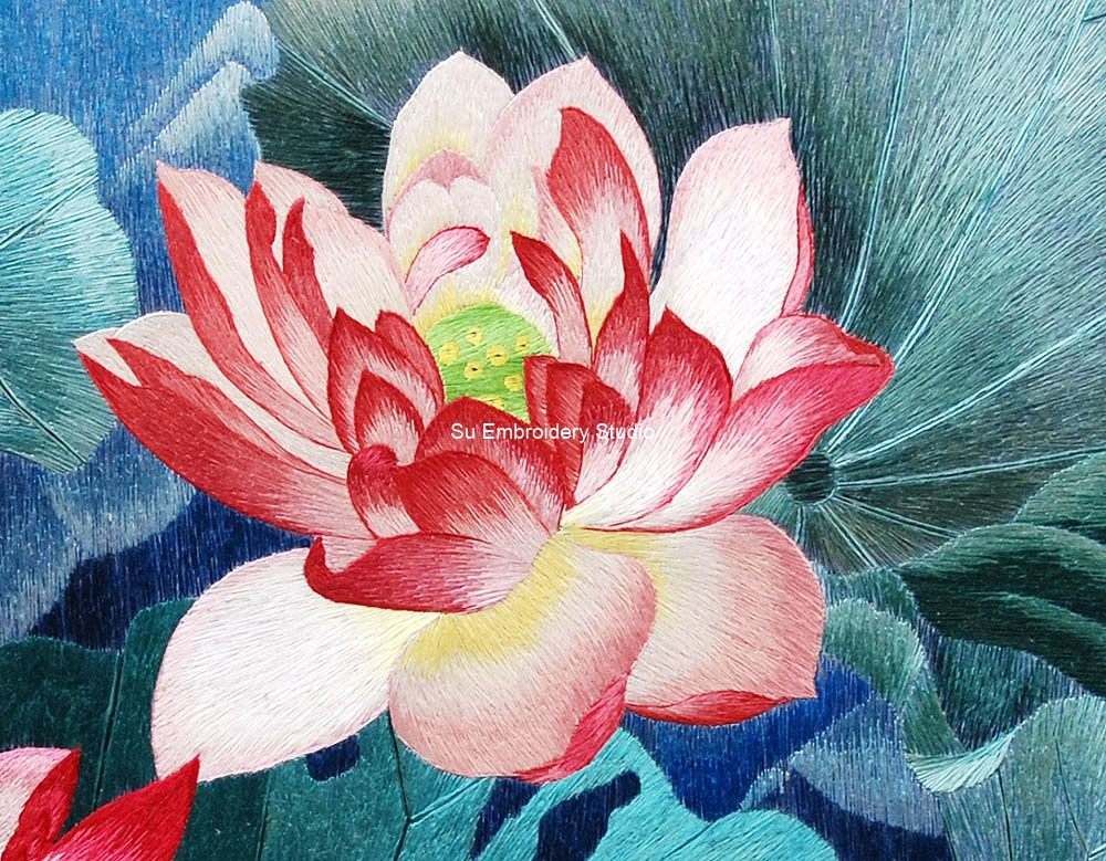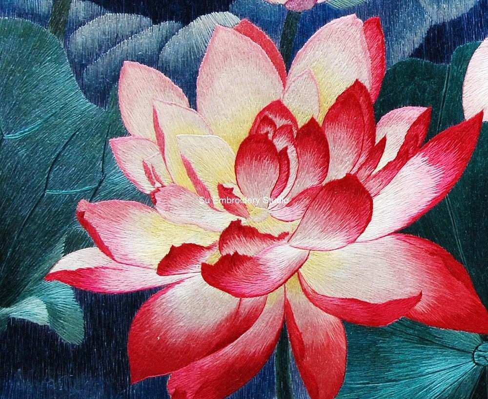 The overall composition exudes a sense of tranquility and harmony, characteristic of traditional Chinese art. The attention to detail in the embroidery elevates the artwork, showcasing the artistry and skill of the embroiderer. This Chinese Su embroidery is a beautiful celebration of the lotus, a symbol of purity and enlightenment, rendered with finesse and precision.
