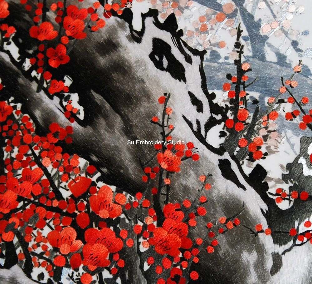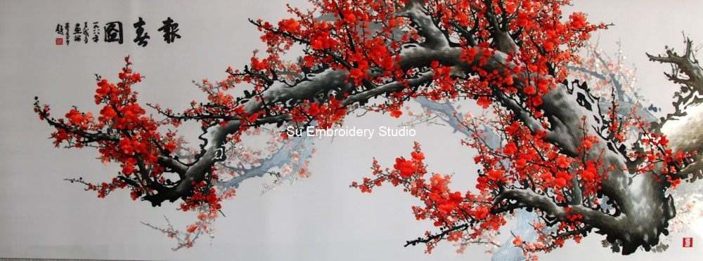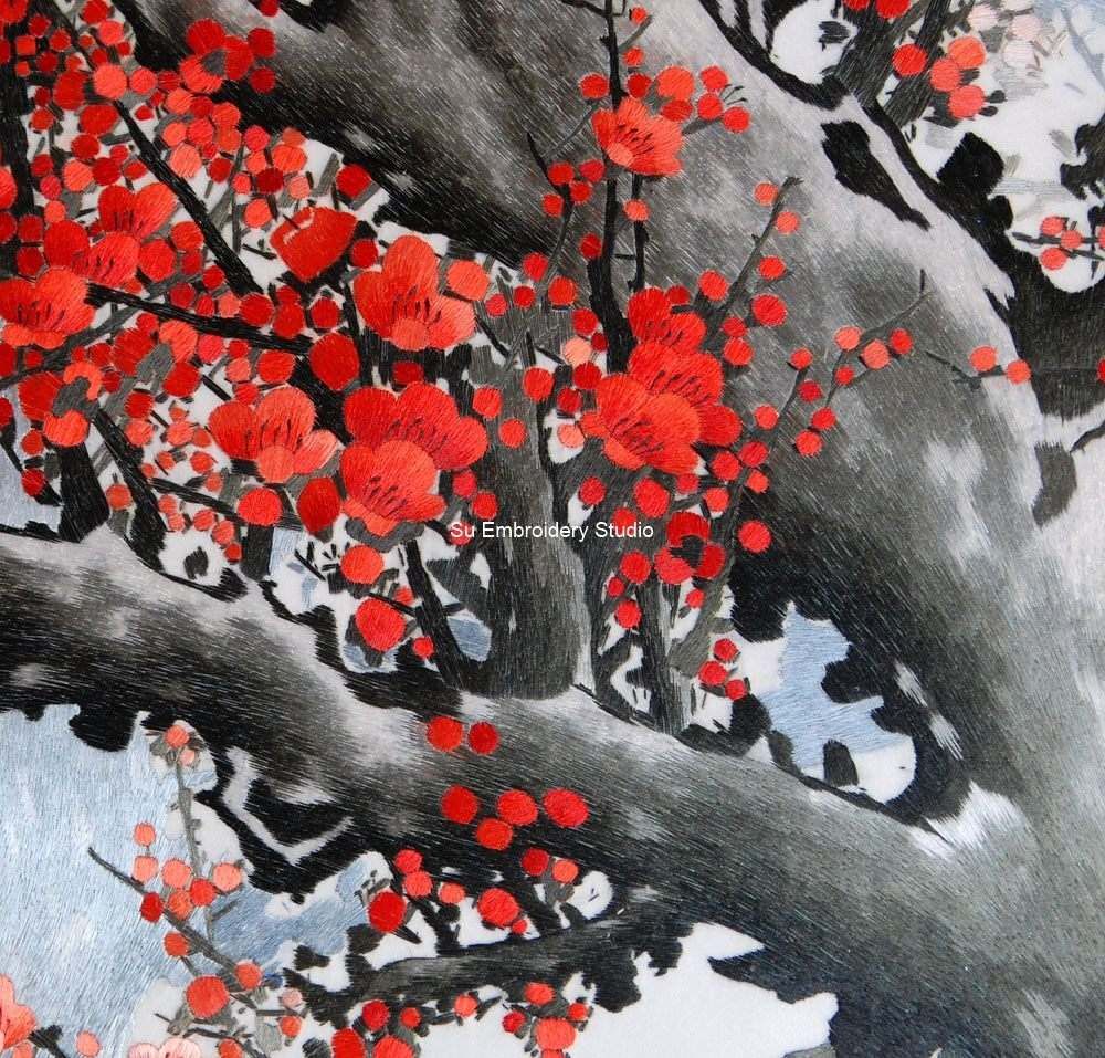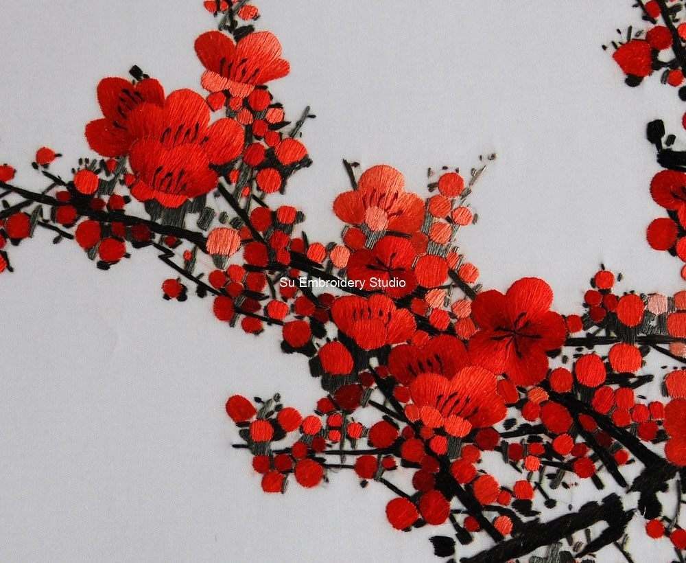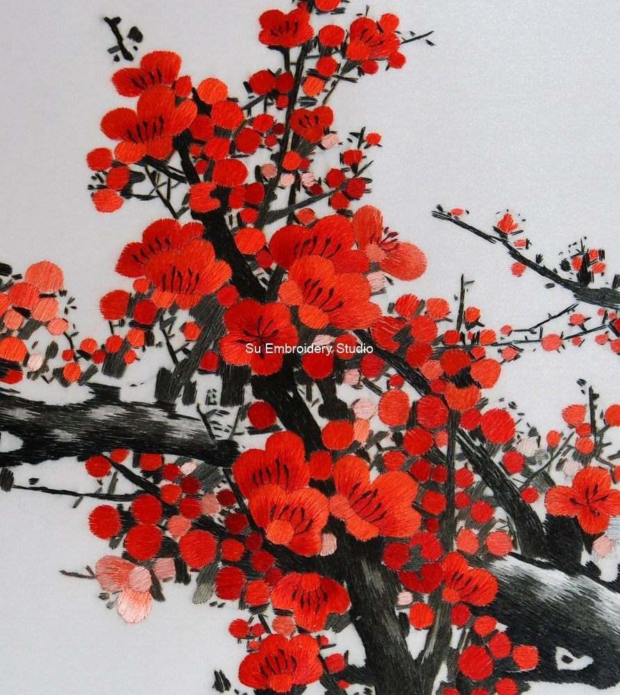 This exquisite Chinese embroidery is a masterfully hand-embroidered silk art piece, showcasing the beauty of a blossoming tree adorned with vibrant red plum flowers. The meticulous craftsmanship evident in every stitch captures the delicate and detailed nature of each flower and branch, creating a visually stunning and lifelike representation.