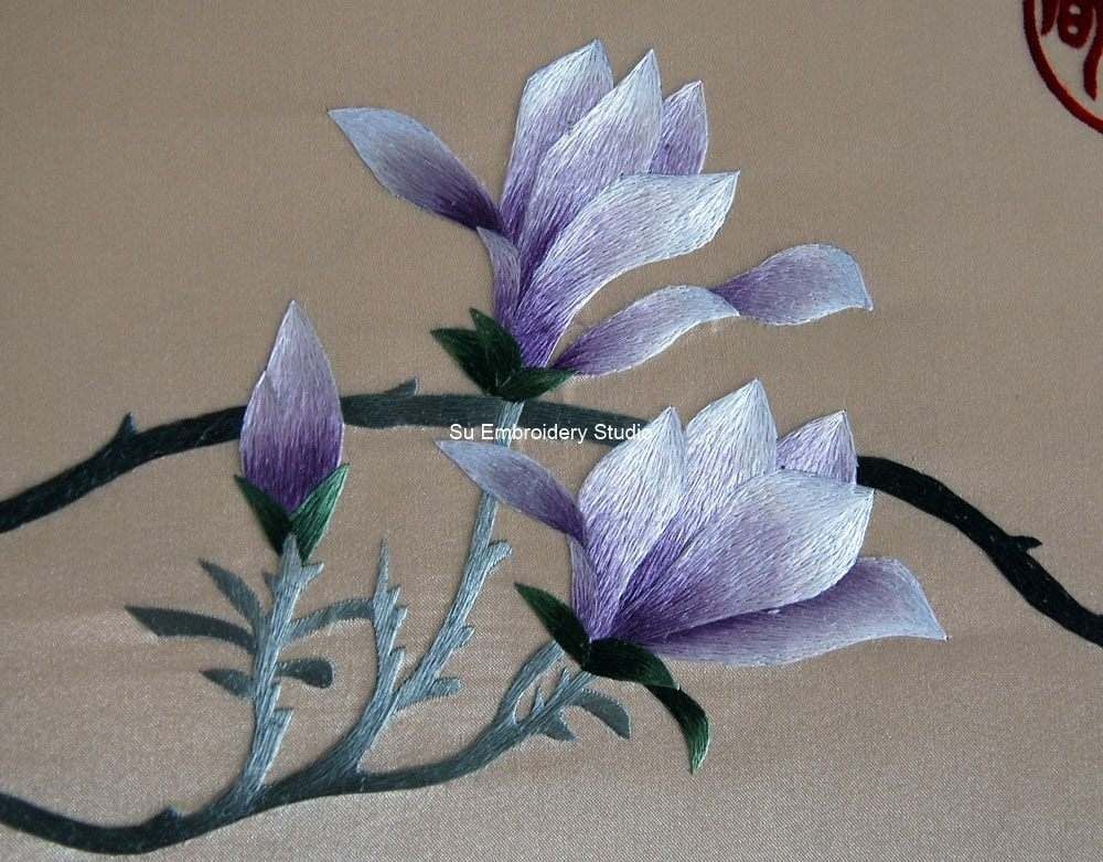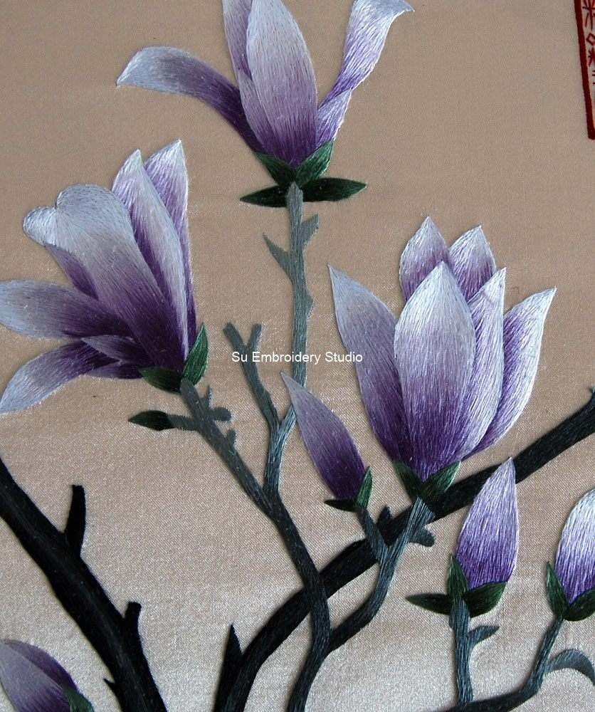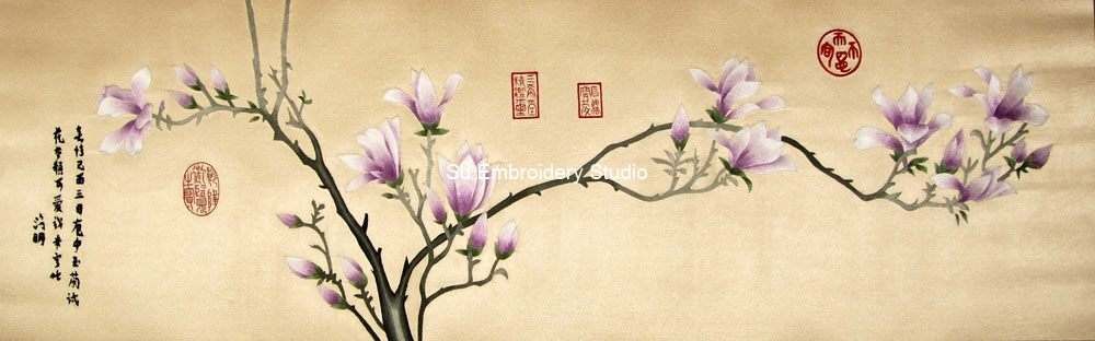 This is a beautiful Chinese silk embroidery featuring a delicate and intricate design of magnolia branches with blooming flowers against a beige silk background. The silk embroidery artwork is detailed, showcasing the finesse in the stitching technique used to create the lifelike flowers and branches. The magnolia flowers are in various stages of bloom, showcasing petals in shades of white and purple, giving a realistic touch. The branches are dark brown with green leaves, intricately stitched to portray natural curves and bends. To the left side, there is vertical Chinese text embroidered in black silk threads along with two red seals that add authenticity to the artwork. Two additional red seals are placed at strategic points on the right side of the artwork, complementing the overall aesthetic. The background is plain beige silk which highlights the colorful hand embroidery, making it stand out prominently.