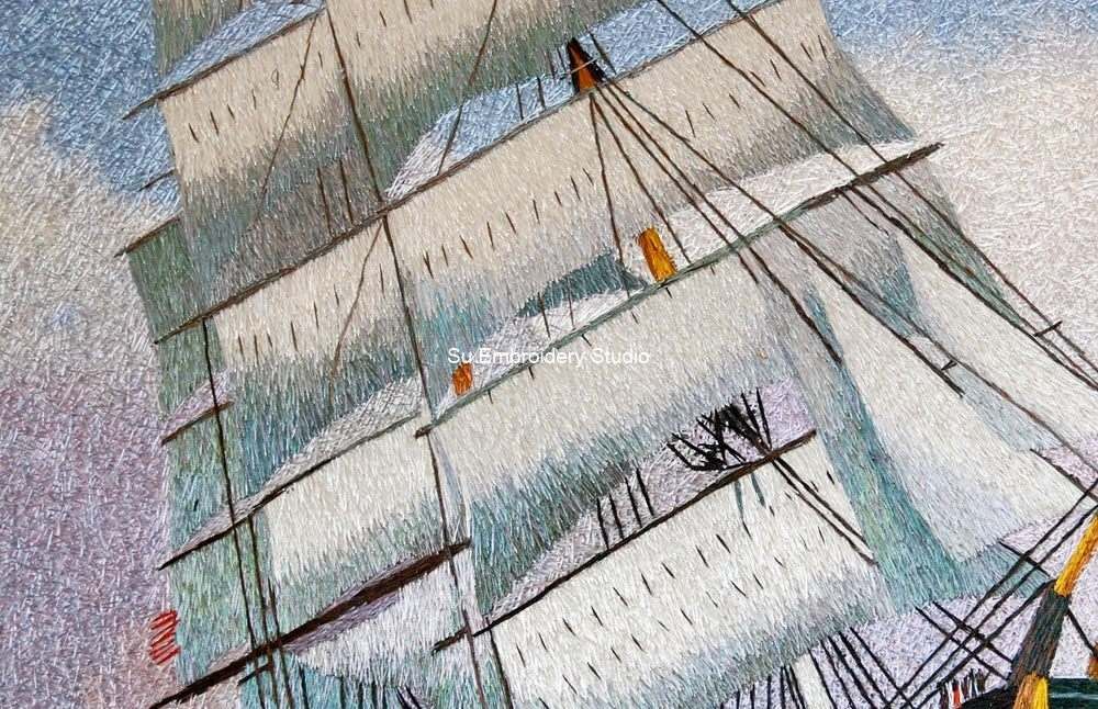 This seascape silk embroidery not only showcases the technical prowess of Suzhou embroidery but also transports the viewer into the heart of a maritime adventure, where the waves, ships, and sky converge to create a harmonious and visually captivating composition.