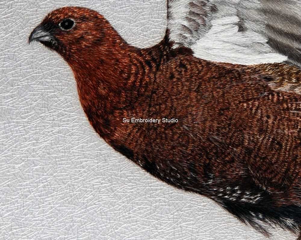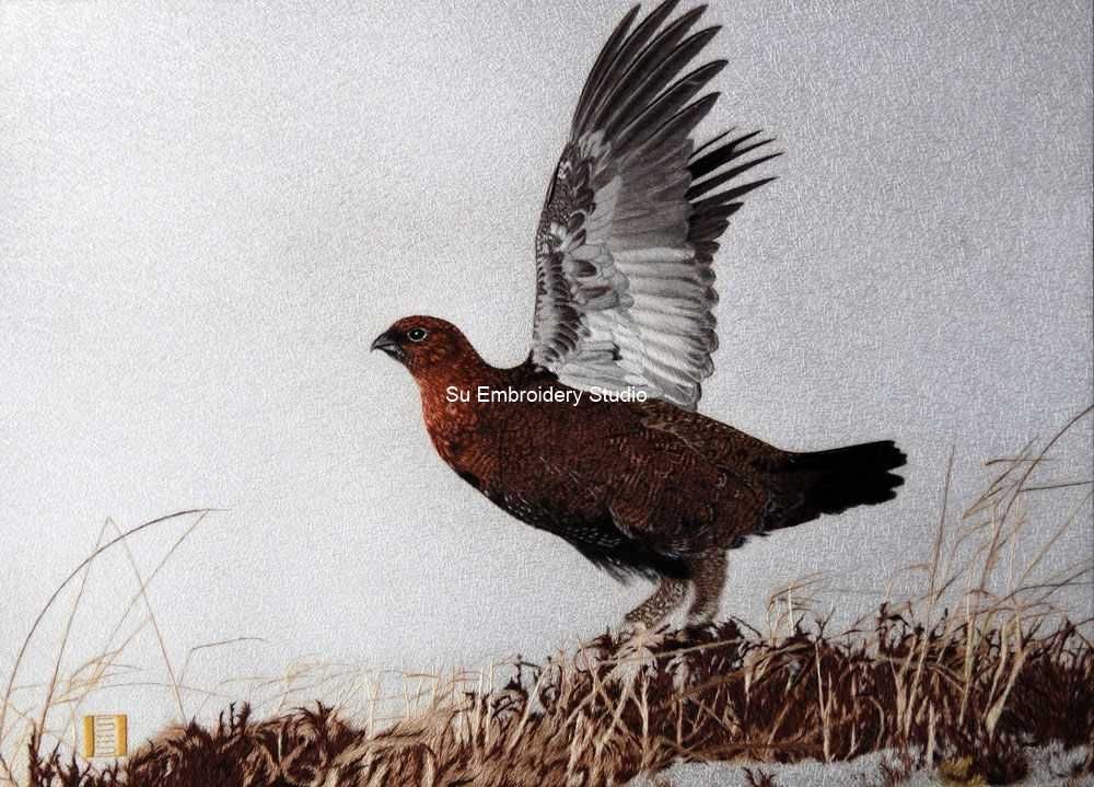This masterpiece of Chinese silk embroidery depicts a Scottish grouse bird. The central figure of the embroidery painting is a red grouse with its wings spread wide open. The bird’s feathers are intricately hand embroidered in short and complicated rantom stitches, displaying various shades of brown and white to highlight texture and movement. The stands amidst dry grass that is finely illustrated to show natural habitat. The fully hand embroidered background is plain yet textured, enhancing the focus on the bird.
