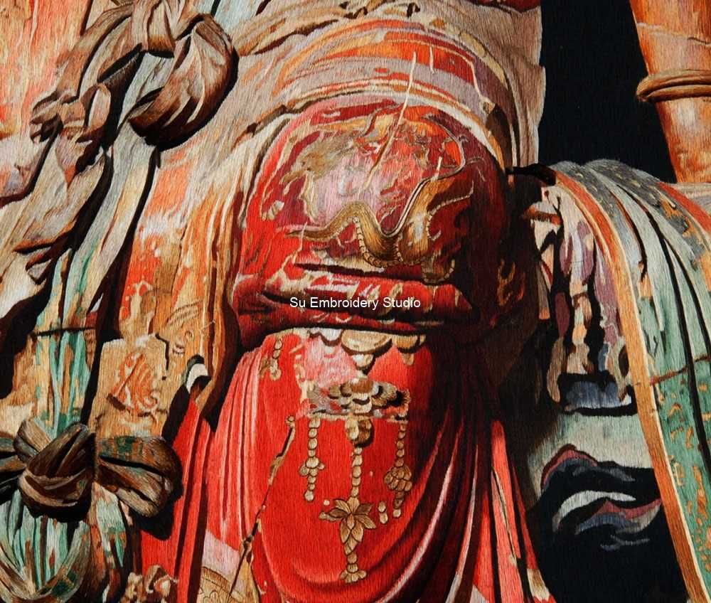 In this embroidery art, the predominant colors of wood and red are meticulously hand embroidered with fine silk threads. The embroidery artwork highlights the minute details, bringing to life the exquisite carvings found on the original statue. The statue, painted in various colors, including prominent red and green hues on the attire, is a testament to the craftsmanship of the Liao Dynasty (907-1125).