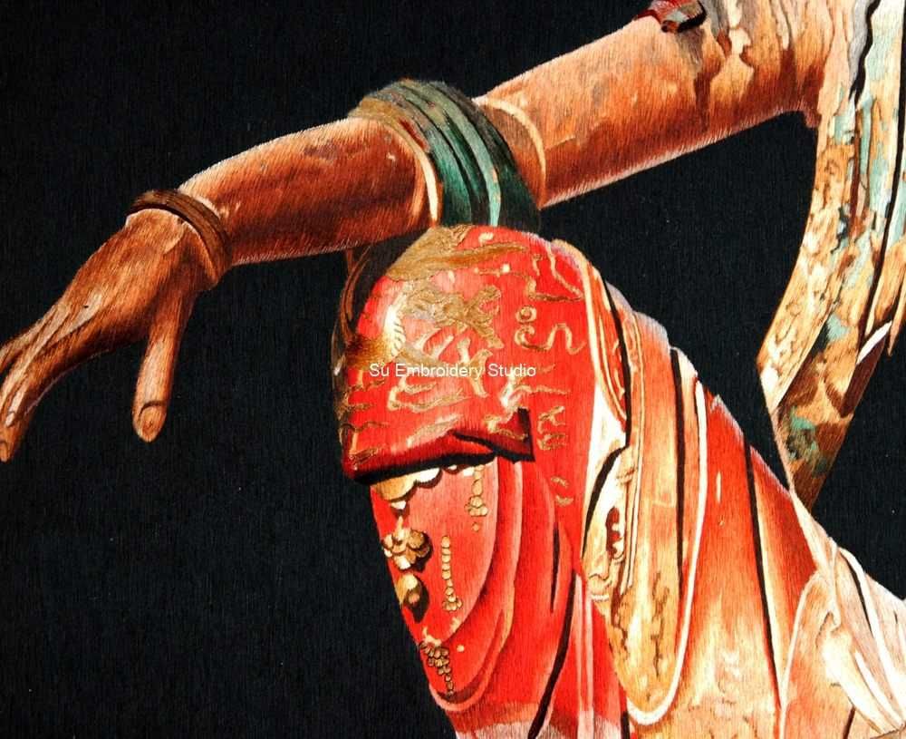 The silk embroidery meticulously breathes life into the wooden sculpture, with the artist employing fine random stitches to replicate its intricate carvings. Using over 500 colors of extremely fine silk threads, the hues are harmoniously blended to mimic the variegated palette found on the wooden figure.