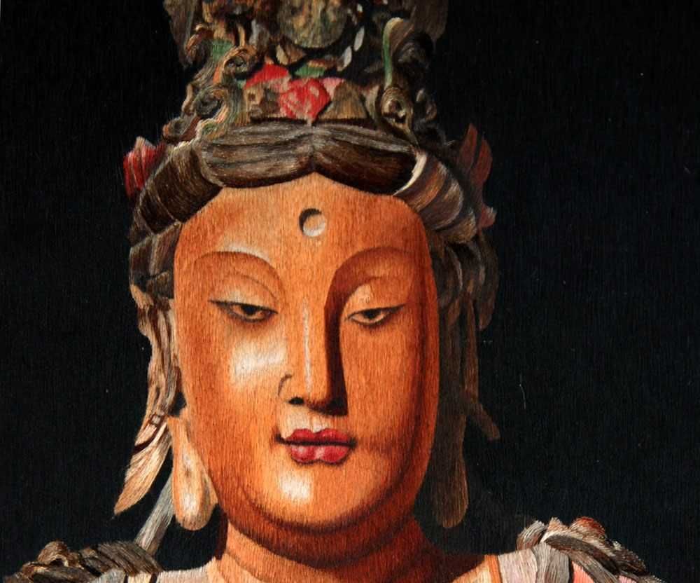This hyper-realistic silk embroidery painting, created over one year by embroidery artists from Su Embroidery Studio, is a remarkable homage to the ancient Chinese Buddhist art embodied by the Seated Guanyin Bodhisattva sculpture. The original 95" by 65" wooden figure stands as one of the best-preserved and most magnificent sculptures from that era.