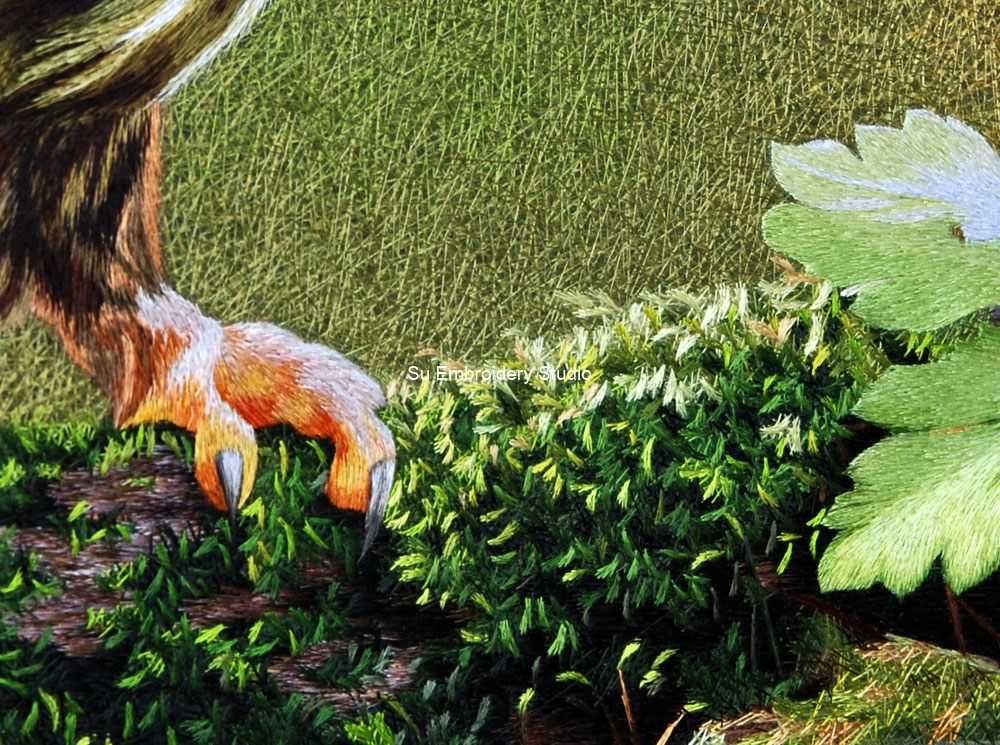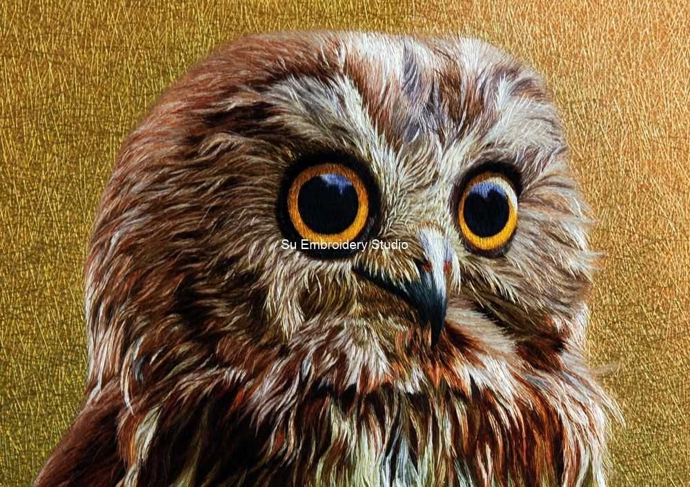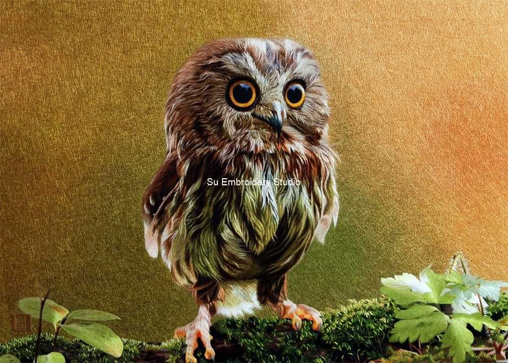 The moss-covered surface beneath the owl is a testament to the Su Embroidery Studio's attention to detail, providing a rich, tactile backdrop that grounds the owl in its natural environment. Surrounding leaves, delicately embroidered, complements the central figure without overshadowing its prominence.
