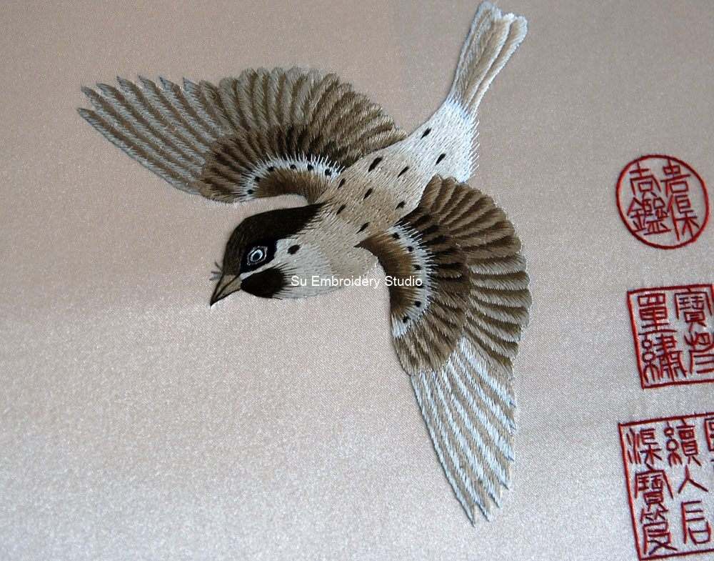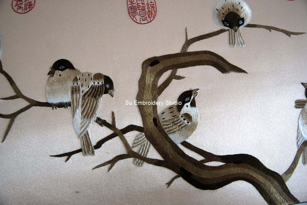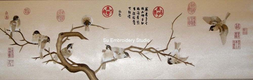 This is a beautiful Chinese silk embroidery depicts sparrows perched and in flight around a leafless tree branch. The intricate stitches create detailed and lifelike representations of the sparrows and branches against a silk background. The embroidery artwork features seven birds, intricately hand embroidered, showcasing various poses such as perching, taking off, and in flight. A prominent leafless tree branch extends horizontally across the piece, serving as a perch for some of the birds. The background is made of silk with a subtle sheen, enhancing the elegance of the silk embroidery artwork. Red stamps and black calligraphy are scattered throughout the embroidery painting adding an element of traditional Chinese artistry. Each bird is hand embroidered with meticulous detail, highlighting individual feathers and expressive postures that bring them to life. The overall mood conveyed is one of serene beauty, capturing a moment in nature with artistic grace.