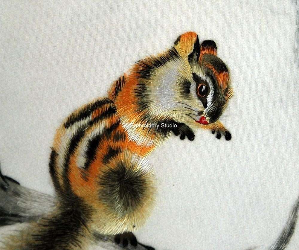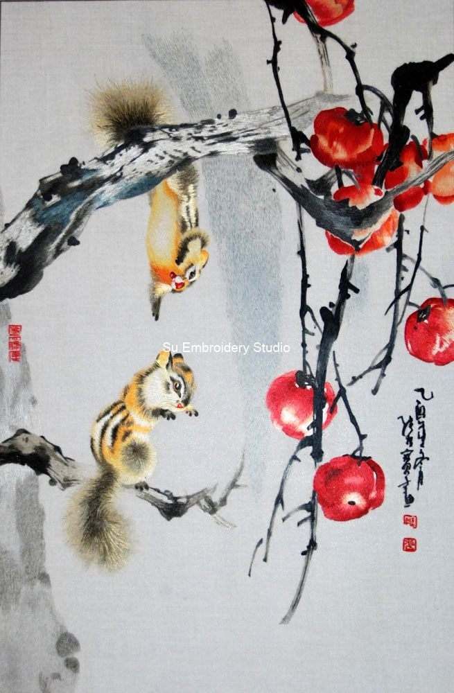 This Chinese embroidery squirrel painting is based on a Chinese ink painting. It is a beautiful and intricate depiction of a serene natural setting, featuring two playful squirrels amidst a tree with ripe persimmons. The squirrels are intricately hand embroidered with fine silk threads, marked by their vibrant fur patterns and expressive eyes. The tree’s dark, textured bark contrasts beautifully with the radiant red persimmons that hang like jewels, ripe and ready for the taking. Each persimmon is stitched with meticulous attention to detail, their luscious color palette reflecting the mastery of silk embroidery art. The backdrop is a harmonious blend of soft hues, creating an ethereal atmosphere that accentuates the lively yet graceful movements of the squirrels. This artwork is a testament to the skill and artistry of traditional craftsmanship, making it a perfect addition for collectors of oriental art.