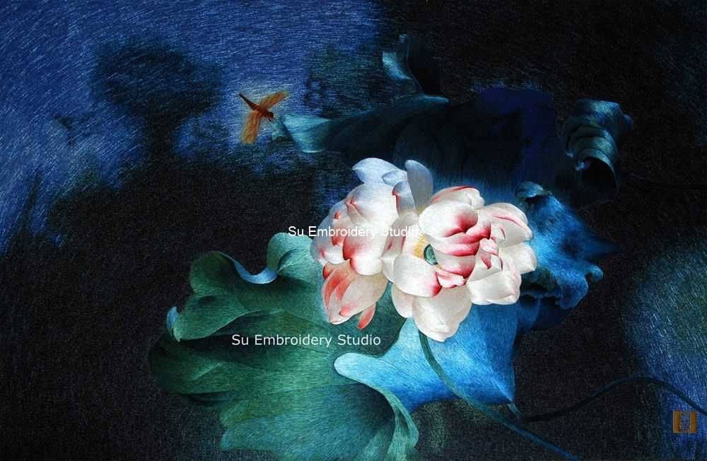 This masterpiece of Chiense silk embroidery depicts two lotus flowers with a dragonfly, showcasing intricate stitching and color blending to create a lifelike representation. The embroidery painting is handmade with fine silk threads that create a textured and detailed effect. Two prominent lotus flowers with white and pink petals are at the center, displaying intricate detailing in smooth and dense plain stitches to highlight the petals’ delicate nature. The lotus flowers are surrounded by dark green leaves, which contrast beautifully against the dark background fully hand embroidered in random stitches. A small orange dragonfly is exquisitely hand embroidered near the top left corner, adding a touch of whimsy to the embroidery art. The background has varying shades of blue and black silk threads, creating a textured and dynamic backdrop that makes the lotus flowers pop. In many cultures, the lotus is revered for its ability to rise above murky waters and bloom in pristine beauty, embodying resilience and grace. The subtle fragrance of the lotus is not overpowering but leaves a lasting impression, much like the quiet moments of peace and reflection that these two flowers inspire.