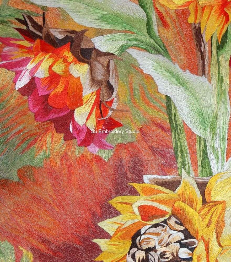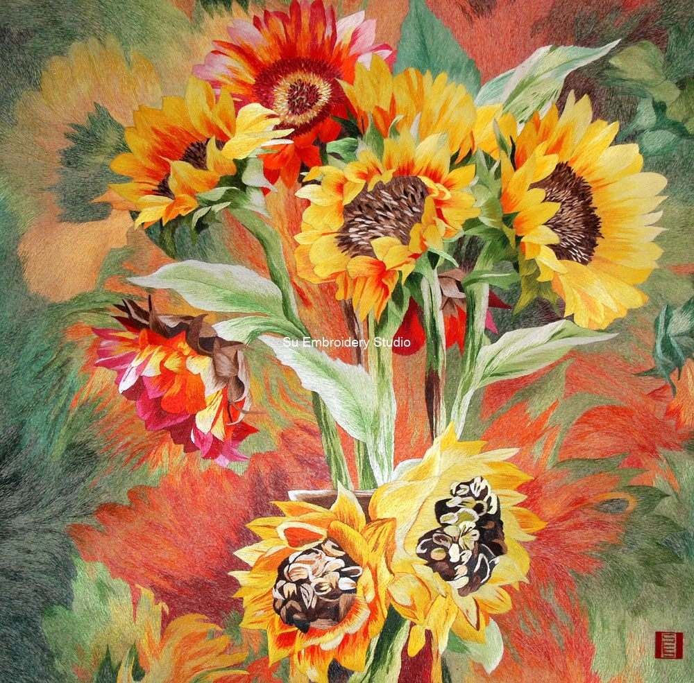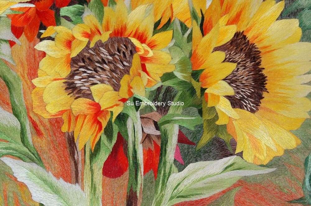 The use of silk threads in this embroidery painting is particularly noteworthy, as it adds a layer of texture and depth to the depiction of the sunflowers. The silk threads are skillfully arranged to capture the lifelike quality of the flowers, creating a tactile and visually engaging experience for the viewer.