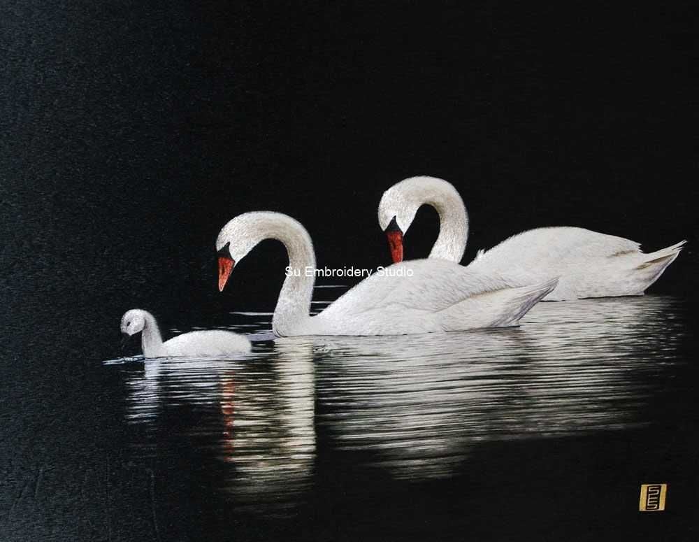 This captivating Chinese silk embroidery painting portrays a serene scene featuring two adult swans and a cygnet gracefully floating on calm waters. Against a dark background that accentuates their pristine white plumage, the swans present a striking image with their long, elegant necks and bright orange beaks, creating a beautiful contrast against their white bodies. The embroidery painting is fully hand embroidered, including the background which is densely embroidered in plain stiches that looks as smooth as a black silk fabric.