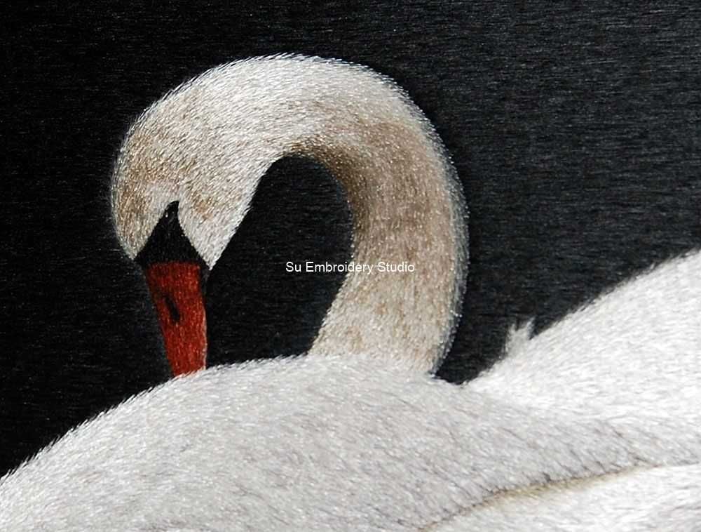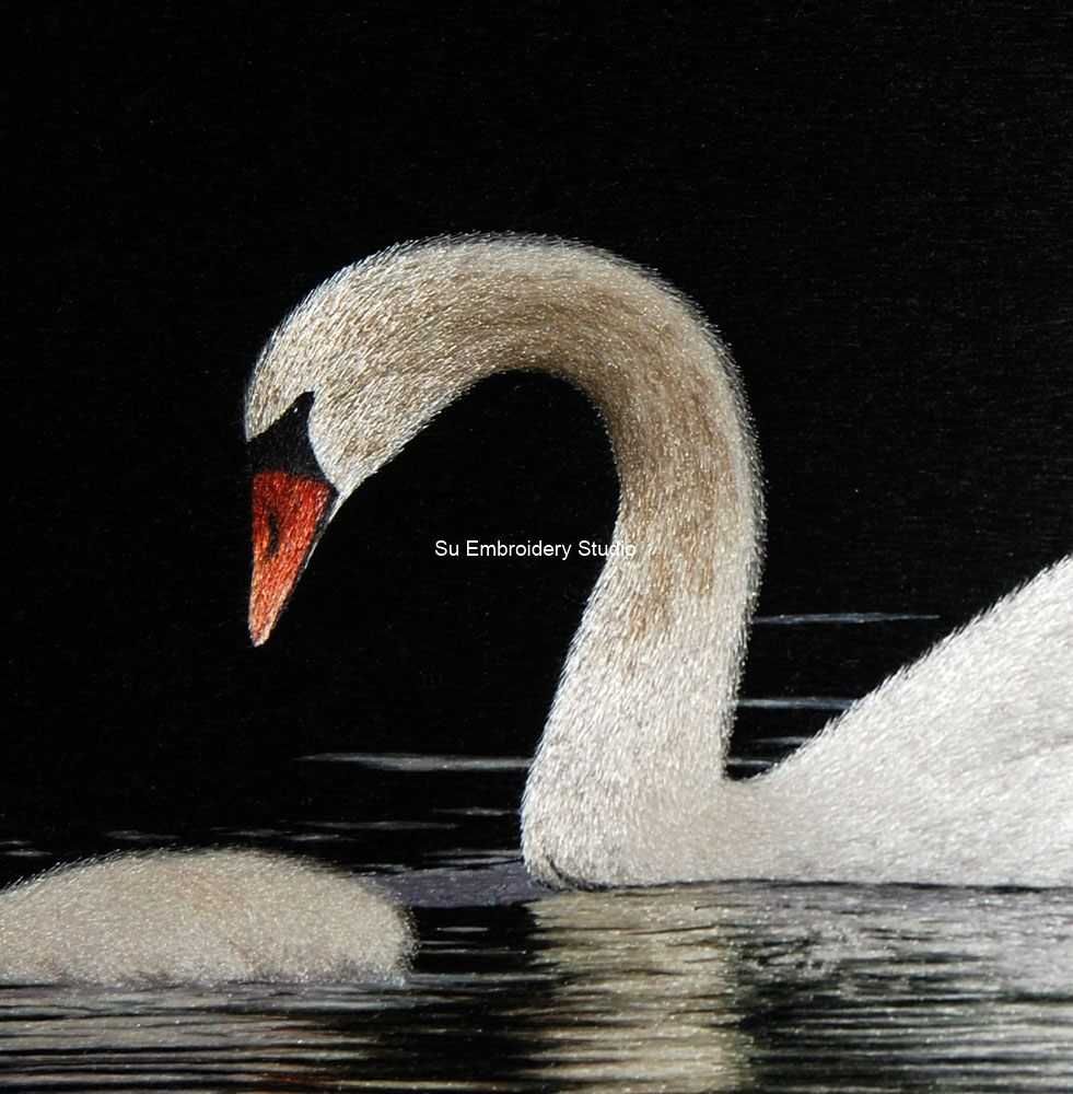 The cygnet, smaller in size and greyish-white in color, adds to the natural diversity of the scene, enhancing the overall visual appeal. The intricate silk embroidery work is a testament to the embroidery artist's hand embroidery skill, capturing not only the smooth texture of the swans' feathers but also the subtle ripples in the water, bringing the scene to life with remarkable detail.