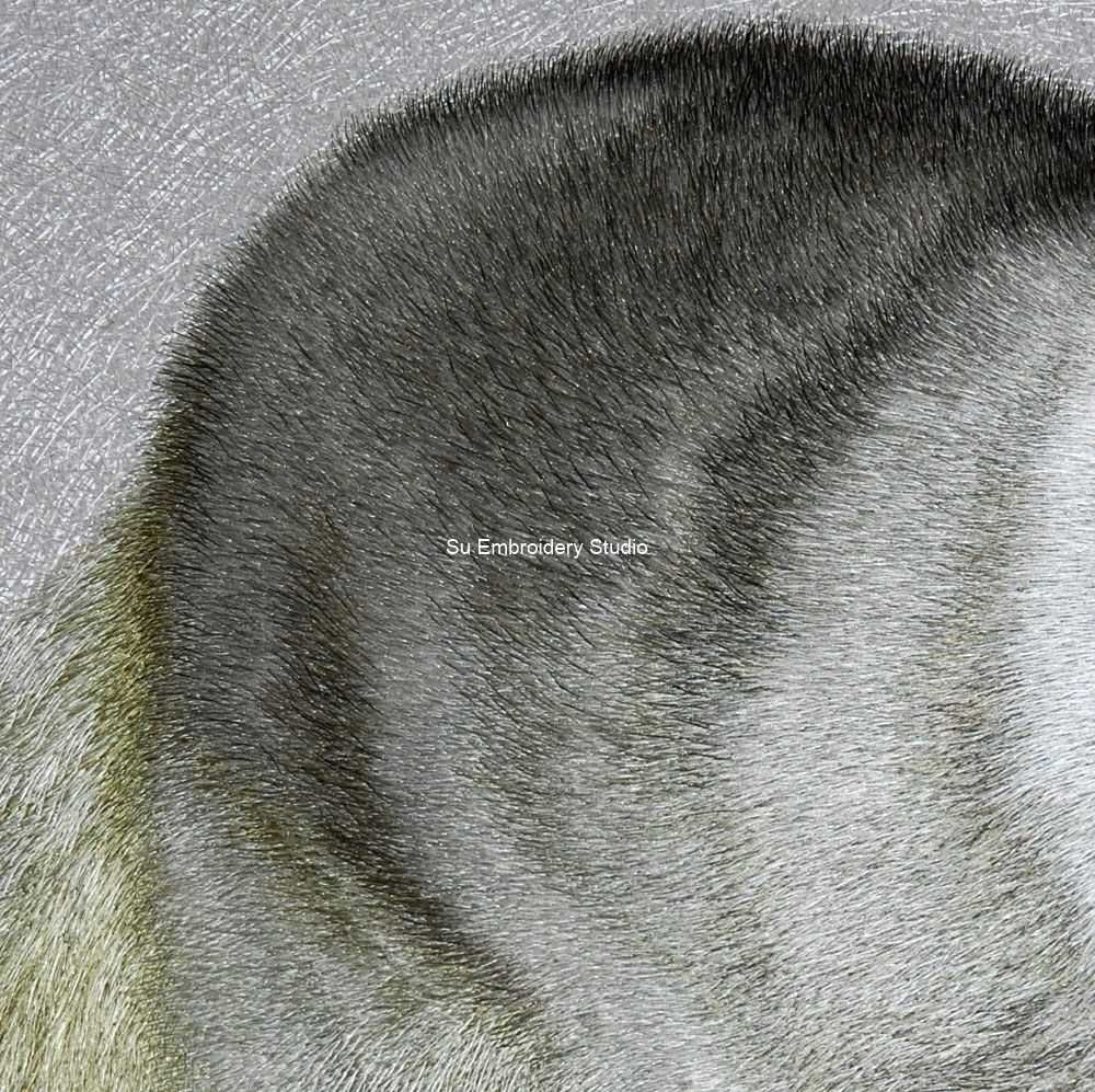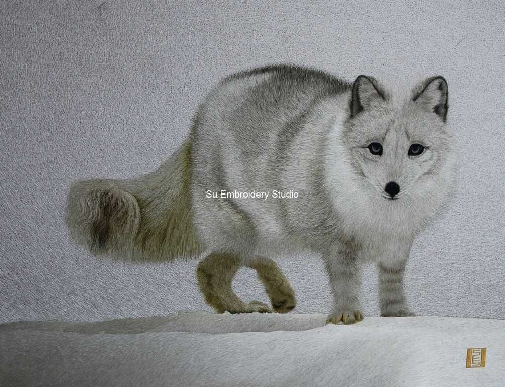 The background is fully hand embroidered in random stitches, featuring a plain greyish-white color. This simplicity not only serves to emphasize the detailed depiction of the fox but also creates a harmonious contrast that enhances the overall visual impact of the silk embroidery.