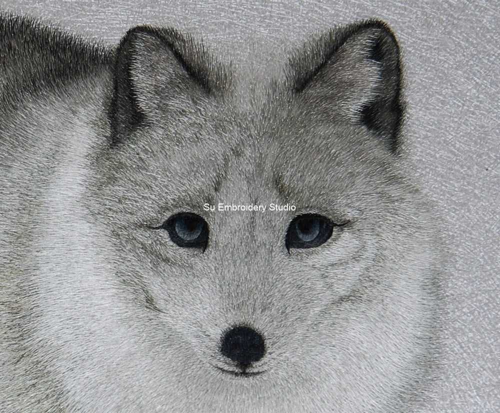 This hyper realistic silk embroidery, faithfully reproduced from a photograph, captures the essence of a white arctic fox in a snowy landscape with intricate silk hand embroidery craftsmanship. The detailed portrayal employs various shades of silk thread to bring forth the lifelike appearance and texture of the animal's fur.