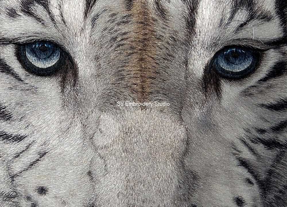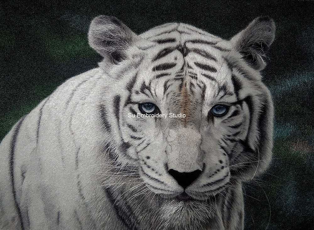 The intensity of the white tiger's gaze is a focal point, with its striking blue eyes captivating the viewer and adding a layer of depth to the embroidery artwork. The background, hand embroidered in dark hues with subtle hints of green, masterfully contrasts to enhance the prominence of the white tiger, creating a visually captivating composition.