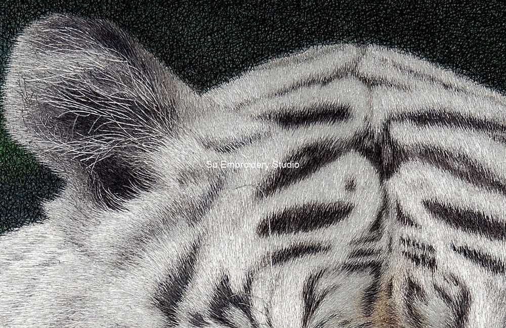 This Masterpiece Chinese silk embroidery depicts a highly realistic white tiger. The intricate silk hand embroidery captures the tiger’s fur texture, patterns, and the intense gaze in its blue eyes. The tiger’s fur is meticulously hand embroidered in short stitches with very fine silk threads, showcasing various shades of white and grey to depict the natural texture and patterns. Its blue eyes are prominent, giving an intense and captivating look. The fully hand embroidered background is dark with hints of green, creating a contrast that makes the white tiger stand out prominently. Every strand of fur, whisker, and detail in the eyes is captured with high precision, showcasing the incredible hand embroidery skill involved in creating this Chinese embroidery artwork.