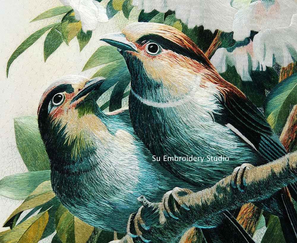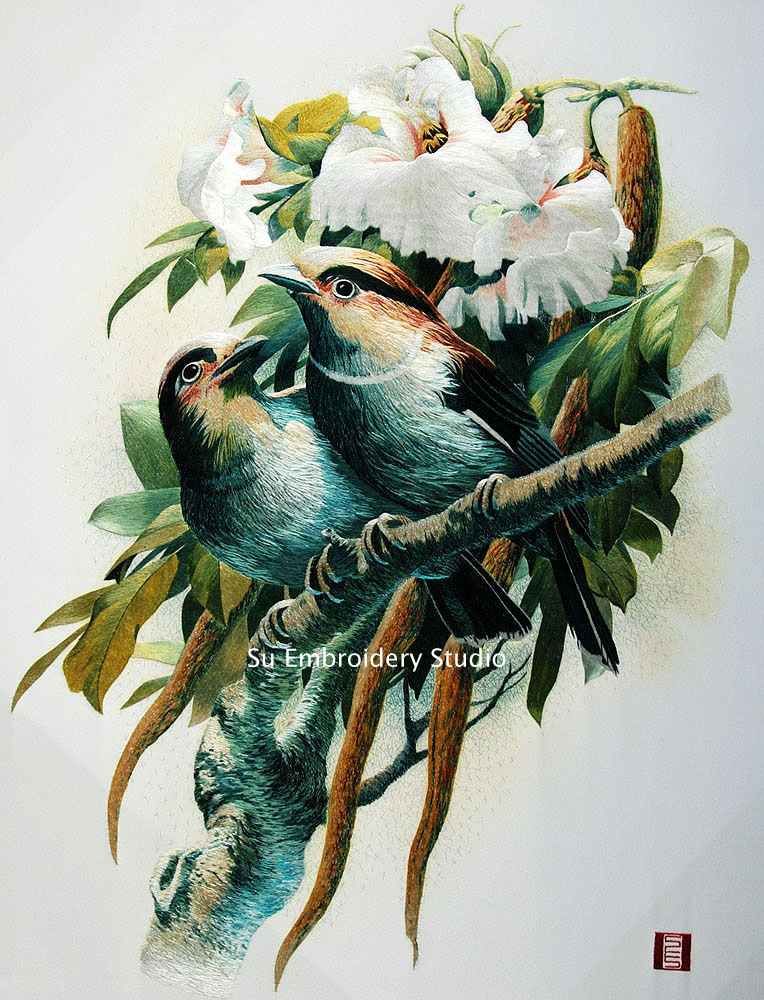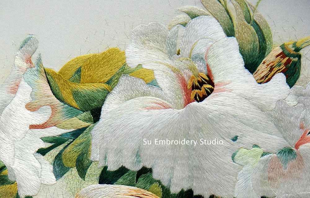 It is all hand embroidered with fine silk threads by embroidery artists from Su Embroidery Studio in Suzhou, China.