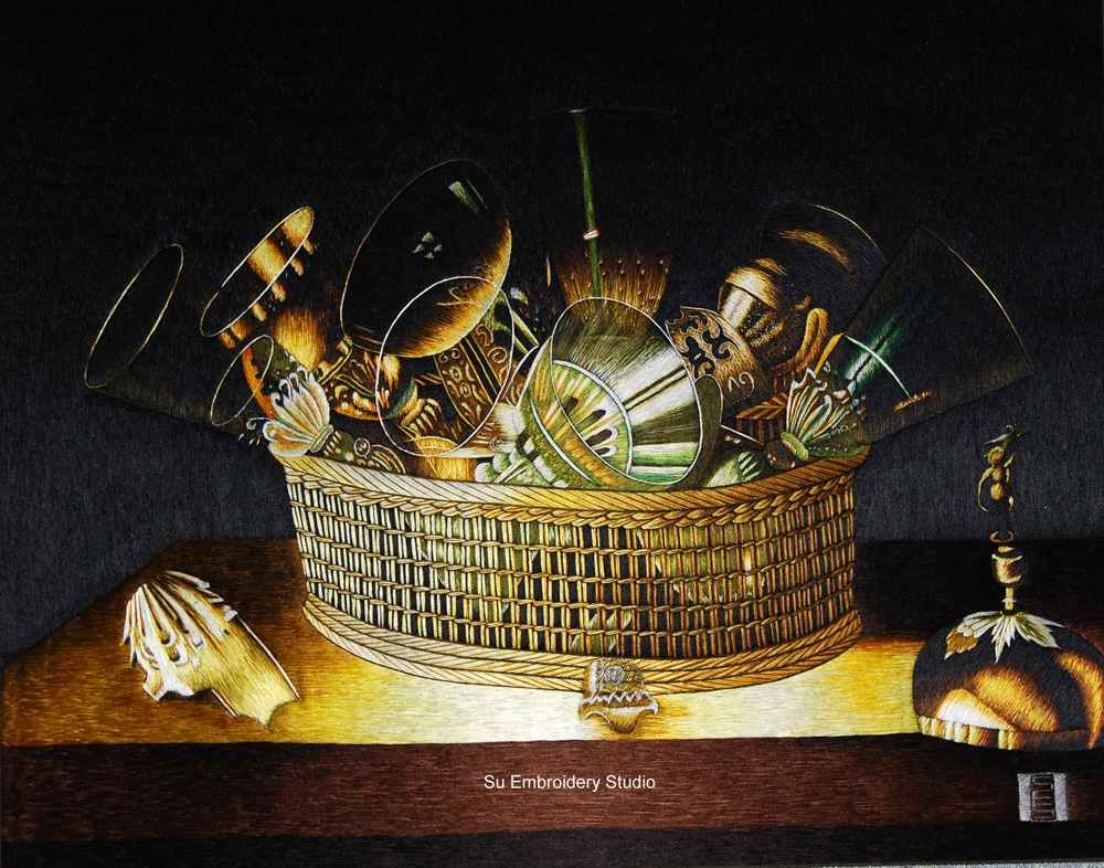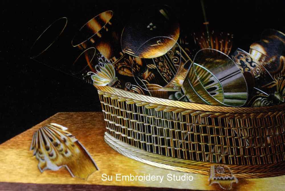 This exquisite Chinese silk embroidery painting captures a still life scene with remarkable detail and precision, based on an oil painting by Sebastian Stostopff. The composition features a wicker basket brimming with an assortment of glassware and metallic objects, each hand embroidered with meticulous care. Traditional plain stitches are used to create a smooth, silk satin-like plain black background, providing a sharp contrast to the brilliant gold colors of the basket and generating a strong visual impact.
