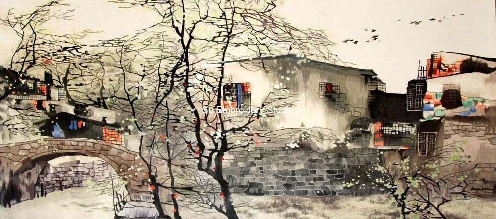 This Chinese hand embroidery artwork is a captivating portrayal of a serene and picturesque scene featuring a traditional Chinese village. Executed with remarkable detail and intricate hand embroidery skills, the artwork captures the essence of a tranquil village setting with stone houses, an arched bridge, and elements of everyday life.