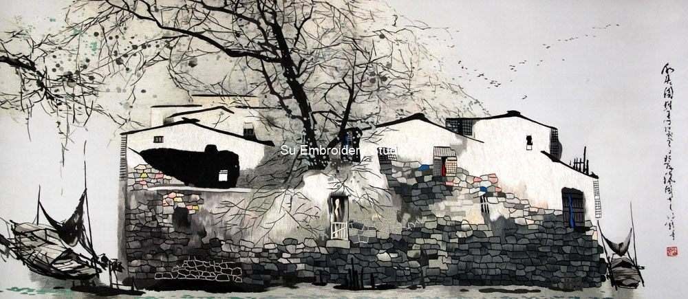 This Chinese silk embroidery depicts a serene and artistic representation of a traditional Chinese village scene. The hand embroidery is highly detailed, showcasing intricate silk embroidery skills. The houses have grey walls and red windows; some have clothes hanging outside, adding pops of color to the monochromatic base. Bare trees with thin branches are prominently featured in the foreground, adding to the peaceful yet somber mood. Birds can be seen flying in the distant sky, adding life to the scene. The overall mood conveyed by this embroidered silk art is peaceful and reflective, with an artistic blend of natural elements and architecture.