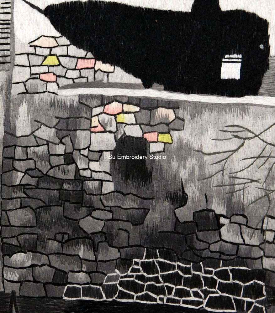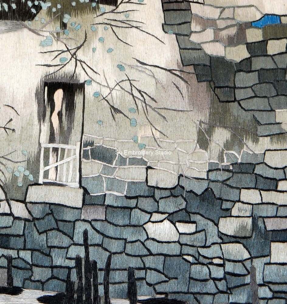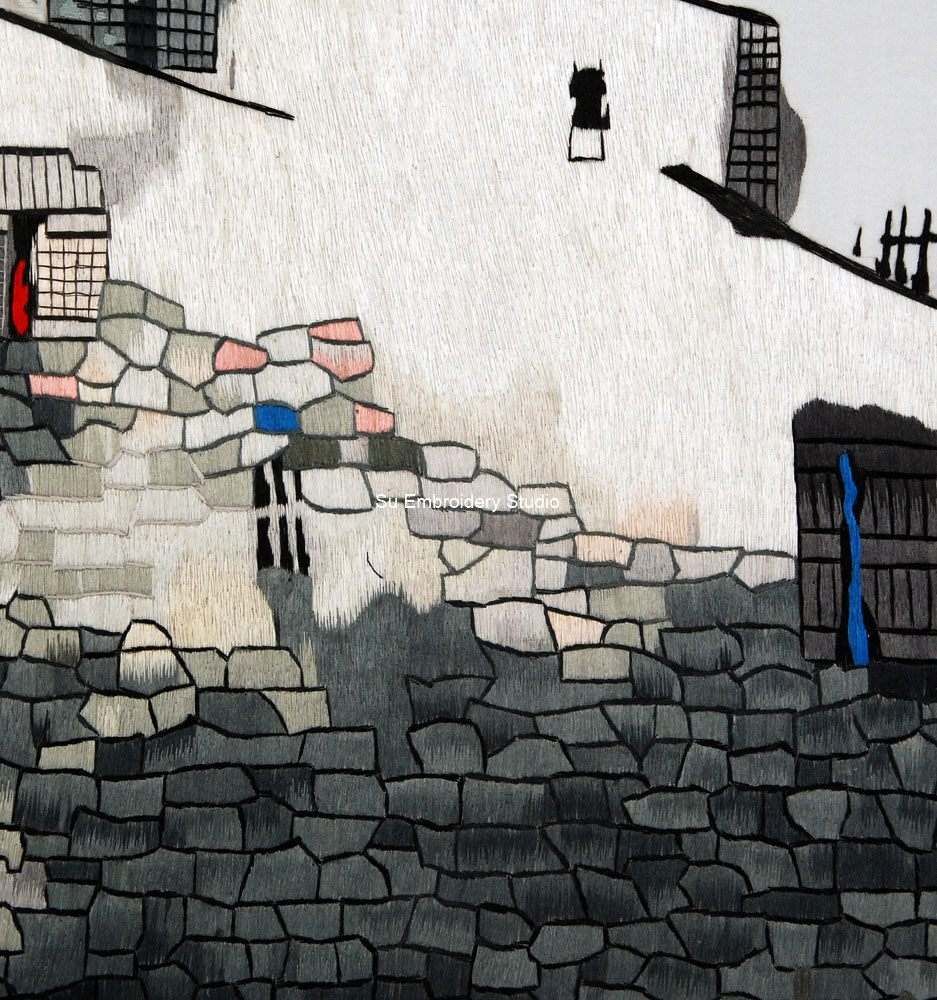 The stone houses, depicted with grey walls and red windows, contribute to the traditional aesthetics of Chinese architecture. The meticulous silk embroidery skillfully captures the architectural details of the structures, showcasing elements such as eaves, walls, and windows with precision. Some houses feature clothes hanging outside, introducing vibrant pops of color against the monochromatic base and providing a glimpse into everyday life.