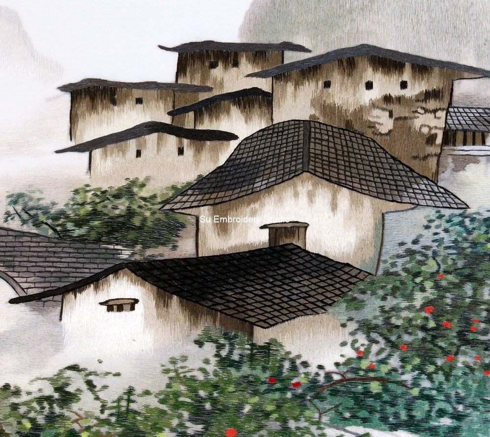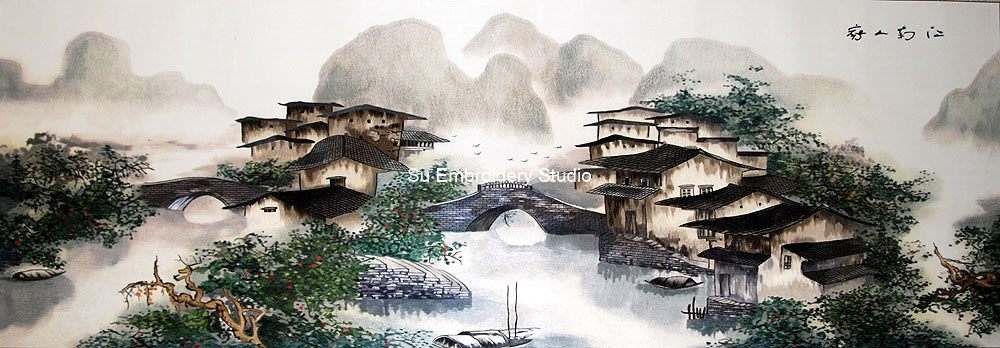 This Chinese embroidery artwork depicts a serene and picturesque landscape featuring traditional Chinese architecture amidst nature in southern China. The intricate stitches bring to life the detailed scenery, showcasing the harmony between human habitation and the natural world. The embroidered artwork is a panoramic view of a tranquil scene set in a misty environment. Traditional Chinese houses with distinct architectural designs are prominently featured; they have grey roofs and are multi-storied. A stone bridge connects two parts of the land, with houses built close to it. The background is adorned with towering mountains that appear to be shrouded in mist, adding an element of mystery and allure to the scene. Lush greenery surrounds the houses; trees with dense foliage are visible, indicating a rich natural habitat. There are boats on calm waters near the houses, suggesting proximity to a river or lake.