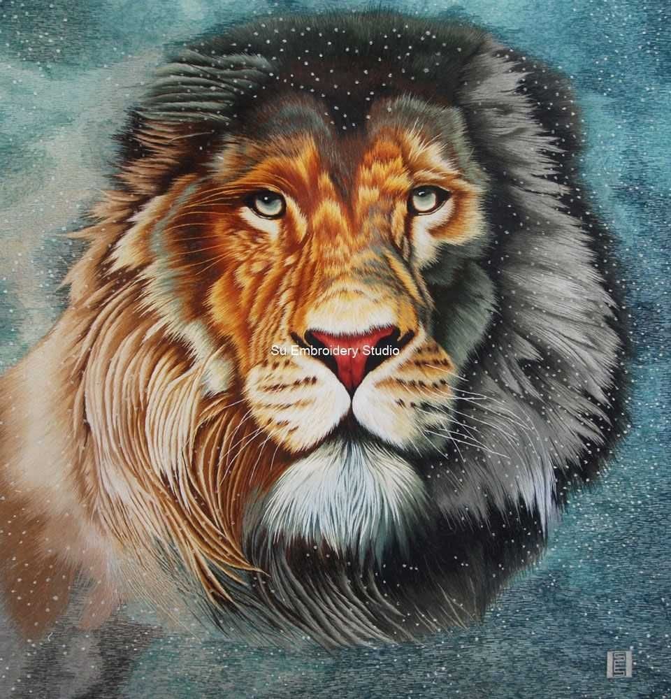 Against a mystical teal background, the lion stands as a symbol of power and nobility. The background, adorned with white snowflakes, adds an ethereal touch, creating a sense of magic and wonder. The skilled use of different shades of thread contributes to the depth and dimensionality of both the lion and its celestial surroundings.