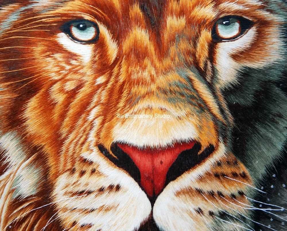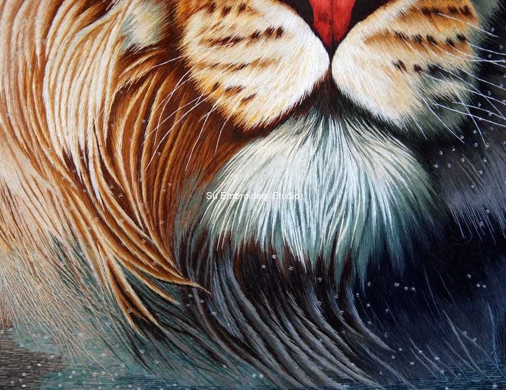 At the heart of the silk embroidery artwork is the majestic lion, its face intricately hand embroidered to perfection. The lion's expressive eyes draw you into its gaze, while the richly colored mane, crafted with various shades of brown, black, and white silk threads, showcases the artist's mastery in creating a lifelike texture. The mane flows gracefully, framing the lion's face with a sense of regality and strength.