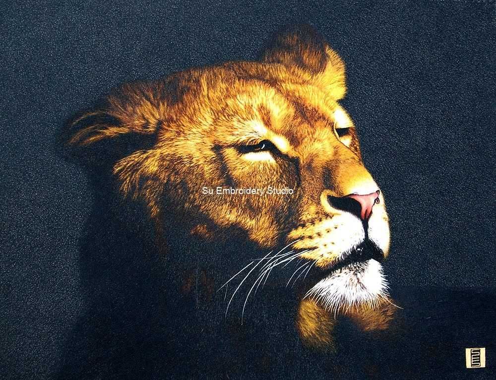 This is Chinese silk embroidery masterpiece depicts a female lion. The intricate stitches create a highly detailed and realistic portrayal, capturing the lion’s majestic and intense expression. The lion is shown in profile, with its gaze directed upwards. Intricate hand embroidery techniques are used to create realistic textures for the fur, whiskers, and other features. The color palette consists of natural tones like browns, whites, and blacks to mimic the actual colors of a lion. The background is fully hand embroidered with dark silk threads, allowing the lion’s features to stand out prominently.