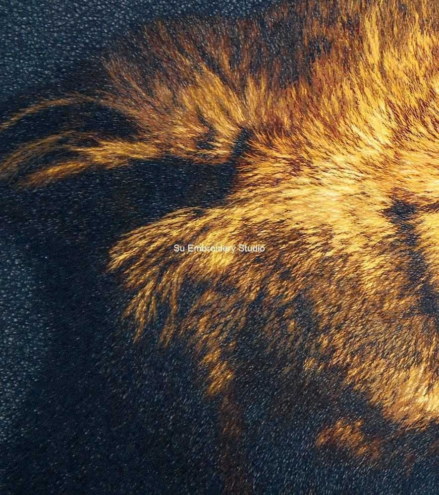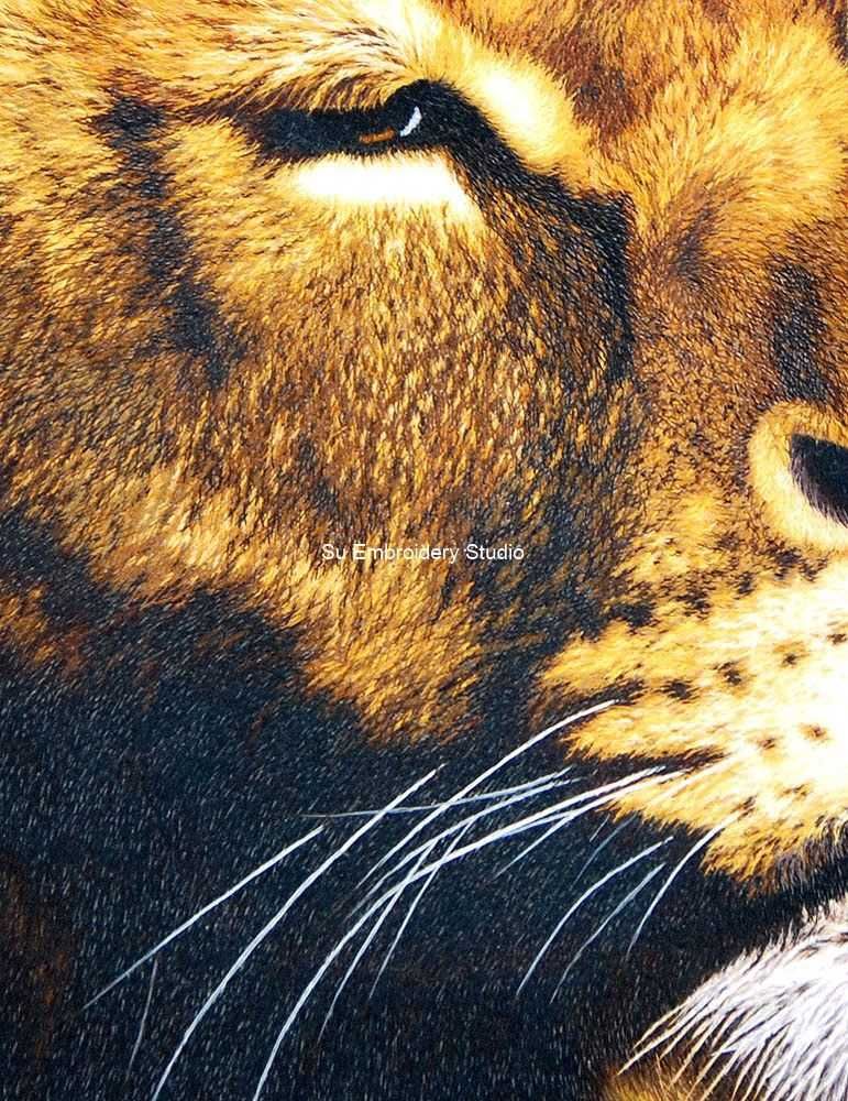 The skilled use of intricate stitching techniques brings the lion to life, creating realistic textures for the fur, whiskers, and other distinctive features. A thoughtfully chosen color palette, incorporating natural tones like browns, whites, and blacks, meticulously mimics the actual colors of a lion, enhancing the authenticity of the silk embroidery artwork. The background, elegantly dark in stitches with black silk threads, serves to accentuate the lion's features, allowing them to stand out prominently against the rich backdrop.
