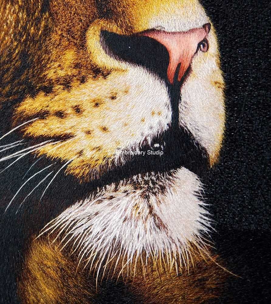 This exquisite luxury silk embroidery showcases the regal visage of a female lion with unparalleled artistry. Crafted with intricate stitches, the portrayal is remarkably detailed and realistic, capturing the majestic and intense expression of the king of the jungle. The lion is presented in profile, its gaze directed upwards, adding a touch of grandeur to the composition.